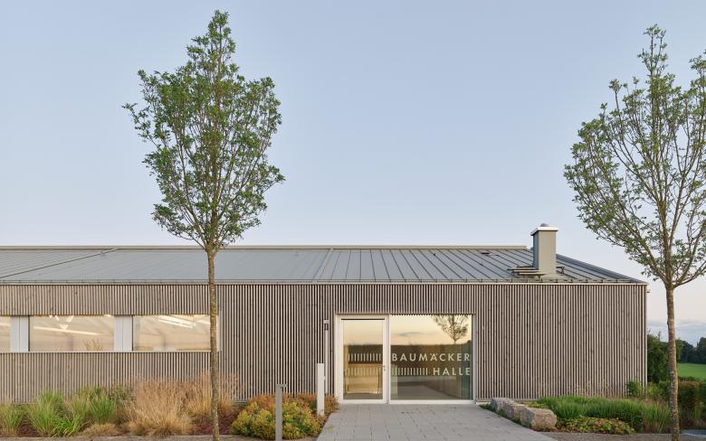 Entsprechend seiner Lage am Hang hat der Neubau zwei Zugänge: Von Norden erscheint die Halle als niedriger, in die Umgebung eingepasster, flacher Langbau. Hier betritt man die Baumäckerhalle im Obergeschoss und hat Blickkontakt in den Halleninnenraum. Auf diesem Geschoss befinden sich die Umkleiden für Sportlerinnen und Sportler. Über eine einläufige Treppe gelangt man in das Foyer im Hanggeschoss, wo sich auch der zweite Zugang für die Schülerinnen und Schüler befindet. Zentral im Foyer liegt die Küche, die Veranstaltungen in der Halle wie auch im Freien gut versorgen kann.