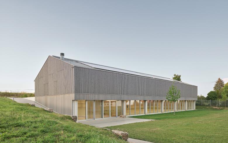 Die geschlossenen Außenwandelemente sind in Holzrahmenbauweise mit einer Fassadenbekleidung aus vertikalen, grau lasierten Lamellen aus Fichtenholz konstruiert. Die Geometrie der Lamellen unterteilt den zweigeschossigen Baukörper und zeigt den Übergang der Bauweisen auch nach außen. Großzügige Verglasungen gestalten die Längsseiten der Halle und ermöglichen einen ungestörten Blickbezug in die Landschaft sowie eine gleichmäßige Belichtung des Innenraums. Fensterbänder im oberen Bereich sorgen für eine natürliche Belüftung der Halle. Für Oberbürgermeister Ingo Bergmann ist diese Halle „ein wichtiges Infrastrukturelement Bihlafingens“, ein Ort des Wohlbefindens für Jung und Alt.