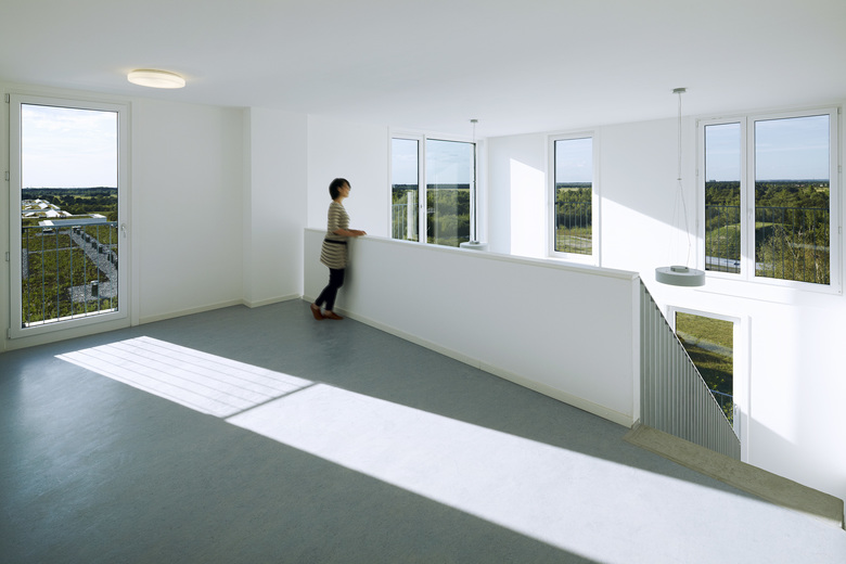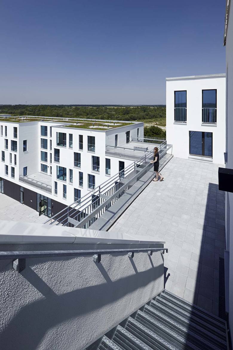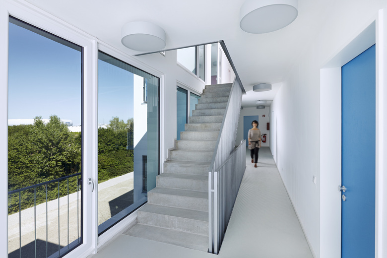 Um das neue Wohngebiet „Haidpark“ im Münchner Norden zur Bahn hin abzuschließen und um dem steigenden Bedarf an Studentischem Wohnen gerecht zu werden wurde 2009 von der Arbeiterwohlfahrt München ein Realisierungswettbewerb ausgeschrieben. BLAUWERK Architekten wurden zusammen mit grabner+huber, Landschaftsarchitekten mit dem 1. Preis in diesem Wettbewerb ausgezeichnet und mit der Planung beauftragt. Das Gebäude schließt den Rand des neu entstandenen Wohnviertels an der nördlichen Stadtgrenze von München. Mit der Form, der Höhe und der Nutzung bildet es in Richtung der U-Bahn-Haltestelle Fröttmaning eine Markierung und einen Eingang zu dem neuen Quartier. Verschiedene Nutzungen wie Studentisches Wohnen, Betreutes Wohnen, Verwaltung, Supermarkt und Gastronomie sind im Erdgeschoss des Gebäudes integriert. Durch seine Form bildet es zwei oeffentliche Plätze aus, die untereinander mit einem Durchgang verbunden sind. Einschnitte, Gemeinschaftsterrassen und Balkone gliedern den Baukörper und stellen einen Bezug zu der umgebenden Bebauung und der Landschaft her. Die Fliederfarbe im Innen- und Außenraum verweist auf die Vegetation in der nördlich angrenzenden Heidelandschaft. Die Farbgestaltung der Innentüren stammt von der Wiener Künstlerin Katherina Mair.