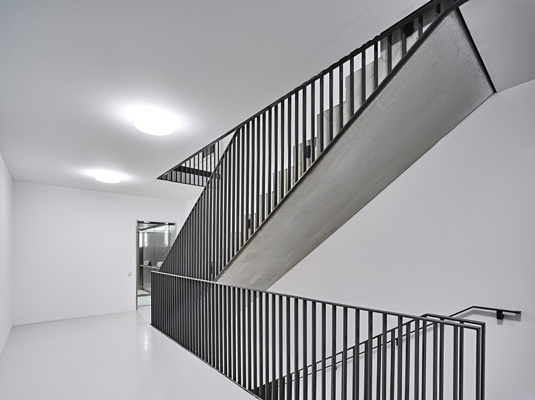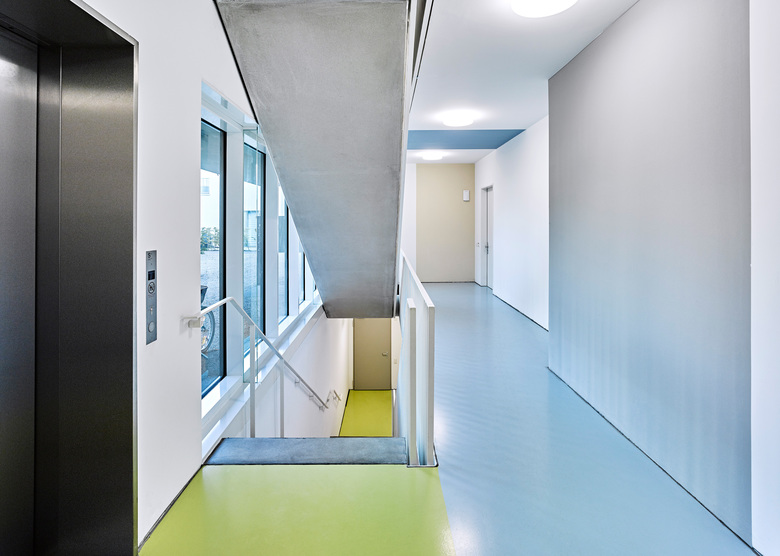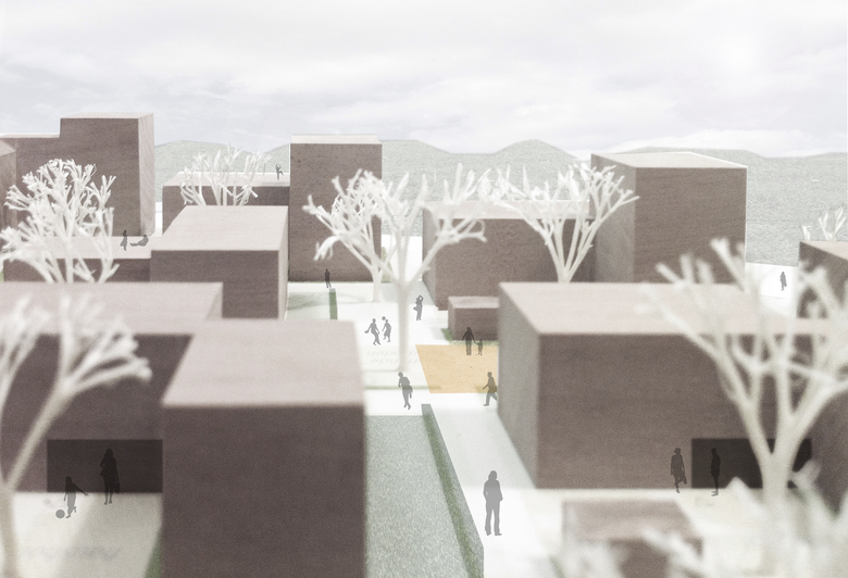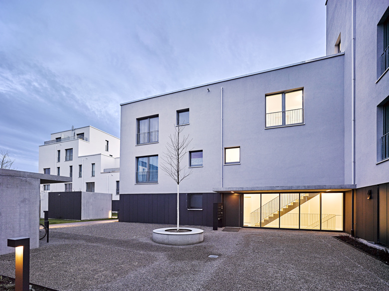 Das Umfeld des Hinterangerfeldes wird durch unterschiedliche Bebauungsformen bestimmt: großmassstaebliche Gewerbeeinheiten, straßenbegleitende Wohnbebauung und Siedlungsstrukturen.Der Entwurf möchte zwischen diesen unterschiedlichen Nachbarn auf folgende Weise vermitteln: Schließung der Bebauung an der Münchener Straße, eine markante dichte Bebauung mit Vorfeld an der Hinterangerstraße, abstaffelnde offenere Bebauung im Inneren. Der zentrale Eingang zum Gebiet erfolgt über einen Durchgang zur Münchener Straße. So sind die Nahversorgungseinrichtungen, der Bahnhof und der öffentliche Nahverkehr auf kurzem Weg erreichbar. Im Inneren gibt es ein informelles Wegesystem, das die Gebäude untereinander und mit der Nachbarschaft verbindet. Fast alle Gebäude haben aufgrund der durchgesteckten Erschließung einen Anschluss an den zentralen Hinteranger. Das Baufeld ist im inneren frei von motorisiertem Verkehr. Im inneren Bereich ist das Gelände angehoben, damit an der Hinterangerstraße über das Hochparterre ausreichend Privatheit und im inneren eine hohe Überdeckung der Tiefgarage für Bepflanzungen möglich wird. Wie der Städtebau möchte auch die Bebauung in ihrer Körnigkeit zwischen den umliegenden Bebauungen vermitteln. Durch ihre Winkelform entstehen halböffentliche, den Eingängen zugeordnete Hoefe, sowie eine effektive gemeinsame Erschließung. Durch Abstaffelungen in der Höhe werden die Baukörper gegliedert, es entstehen vielfältige Dachterrassensituationen. Unterschiedliche Wohntypen können in der Struktur der Winkelhaeuser miteinander kombiniert werden: klassische Wohnungen mit Flur, Wohnungen mit durchgesteckten, zentralen Wohnraeumen, rollstuhlgerechte Wohnungen, Maisonette- und Reihenhaustypen mit Lufträumen. In den Wohnungen an der Münchener Straße sind aus Lärmschutzgruenden alle Wohn- und Individualräume zum Hinteranger orientiert. Alle Wohnungen (teils mit optionalem Aufzug) sind barrierefrei erreichbar. Zwischen den 3 öffentlichen Straßenraeumen mit ihren unterschiedlichen Anschlusshöhen schaelt sich ein inneres Gartenplateau heraus. In dessen Zentrum liegt der neue Hinteranger, ein Treffpunkt für das neue Quartier, mit einem Großbaum akzentuiert. An den Wohnhäusern befinden sich intimere Plaetze kleineren Maßstabs - die Haushöfe mit ihren kleinkronigen identitätsstiftenden Hausbäumen. Das Viertel ist im Bau und wird Ende 2016 fertiggestellt sein. Realisiert werden ein Ärztehaus, ein Geschäftshaus und 7 Wohngebäude zwischen 3 und 5 Geschossen.
