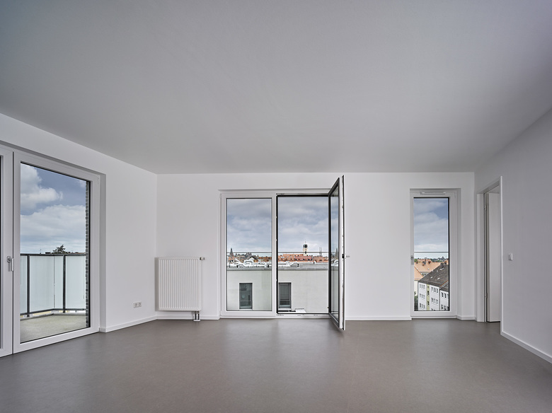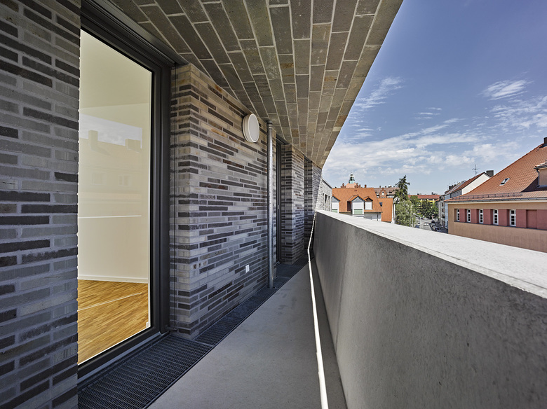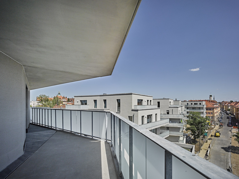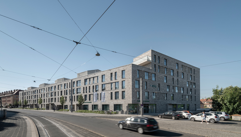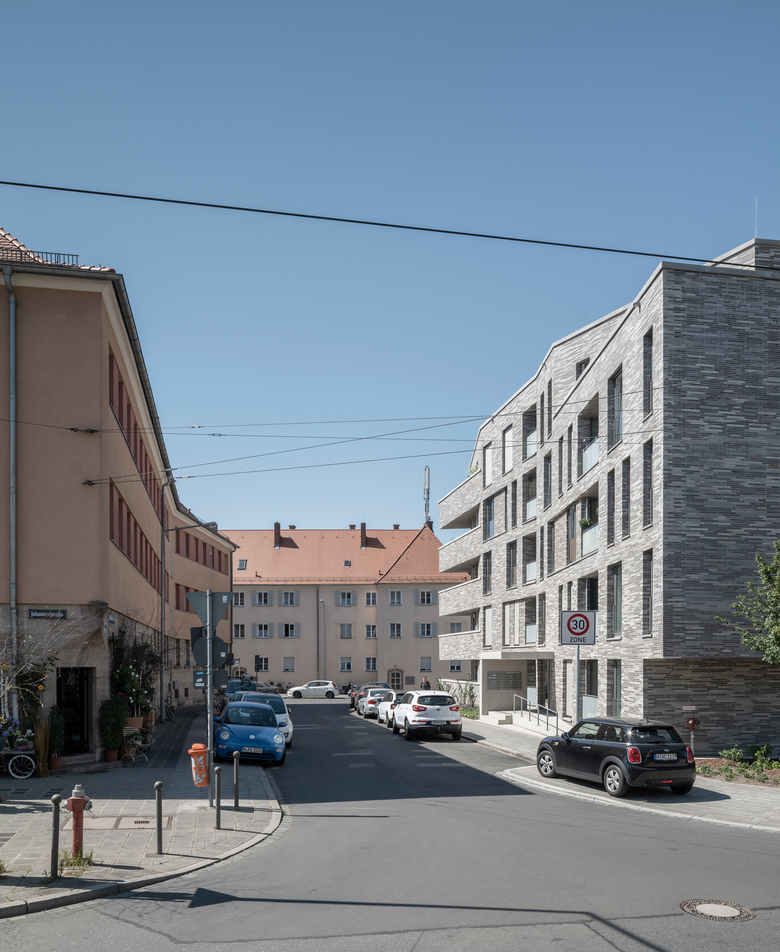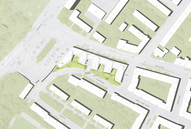 Das Baugrundstück liegt am westlichen Stadteingang Nürnbergs am Rande der Johannissiedlung. Eingebunden in die teils großmaßstäblichen, straßenraumdefinierenden Block- und Mäanderfigungen des Viertels kommt dem neuen Baukörper stadträumlich zweierlei Funktion zu. Zum einen der Abschluss der Siedlungsstrukturen aus den 20èr- 30èr Jahren von Osten und Süden, zum anderen die Markierung des Stadteingangs und raeumliche öffentliche Platzfläche. Um auf dem räumlich beengten Grundstückszuschnitt eine angemessene Belichtungen der Wohnungen zu ermöglichen wird die Figur mit zweierlei Ausformung ausgebildet: 1. entlang der Johannisstraße wird der Stadtraum klar straßenbegleitend definiert und entsprechend des angrenzenden Bestandes ergänzt. 2. Nach Süden hin öffnet sich die Figur ueber fingerartige Bauvolumen, bildet angemessene Außenraumqualitäten aus, sorgt für eine gute Belichtung und einen hohen Außenraumbezug der Wohnungen. Über ein geometrisches Verschwenken wird die Figur in den städtischen Kontext integriert. Die fünf fingerartigen Baukörper im Süden bilden dabei eine feine Differenzierung der Freiräume aus, ohne die Wohnformen und deren Gruenflächen voneinander zu separieren. Die Bebauung entlang der Johannisstraße schützt das Innere der Bebauung vor Verkehrslärm, schallschützende Wintergärten erlauben eine Orientierung von Aufenthaltsraeumen zur Johannisstraße. Der VI-geschossige Baukörper im Westen bildet einerseits den Stadteingang vom Nordwestring aus, andererseits schließt er von Osten den Straßenraum der Siedlung raumprägend ab. In seinen unteren Geschossen ist eine zweigruppige Kita mit Freiflächen angeordnet. Im Erdgeschoss wird über eine öffentliche, fußläufige Durchwegung die Nachbarschaft an die Johannisstraße angebunden, die erdgeschossige Einrichtung der Sigena dient als gemeinschaftlicher Treffpunkt, ein kleiner Freibereich mit Sitzmöglichkeiten lädt zum Verweilen ein. Das Gebäude ist genehmigt und in der Werkplanung, Fertigstellung wird 2018 sein.