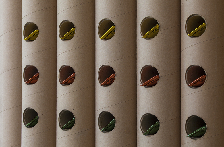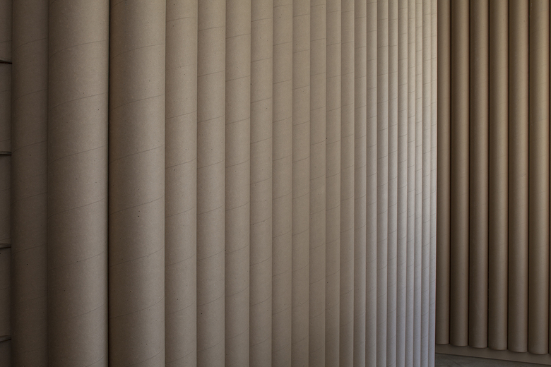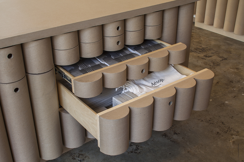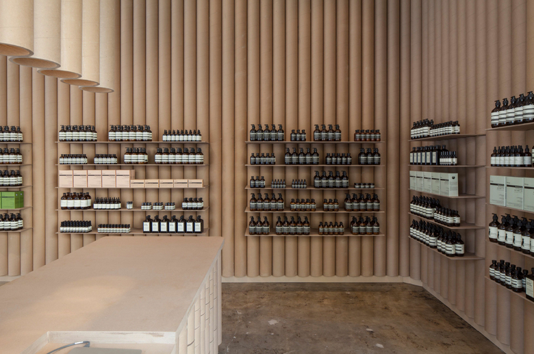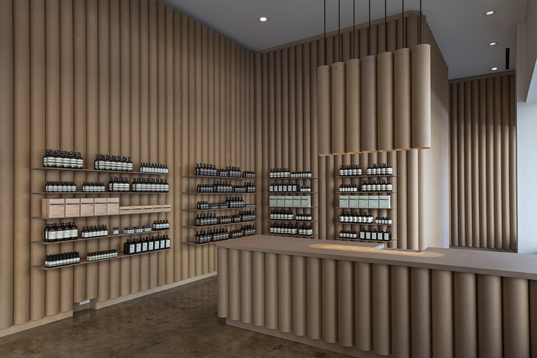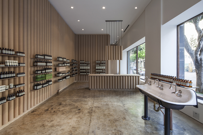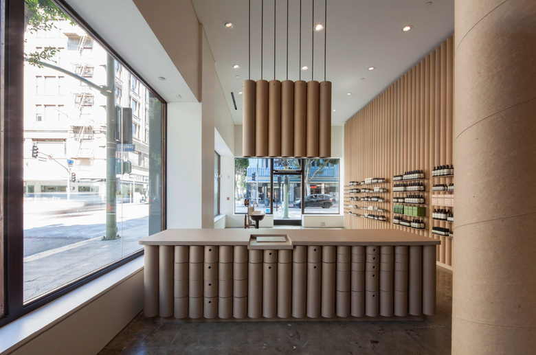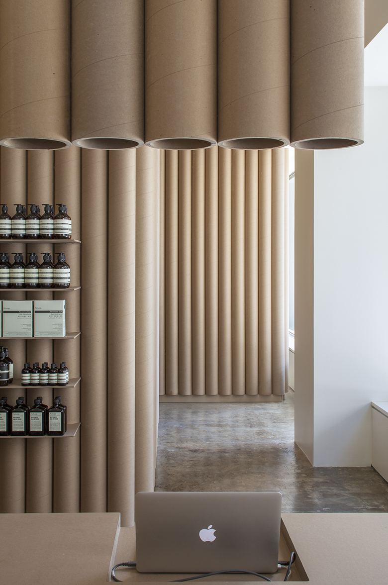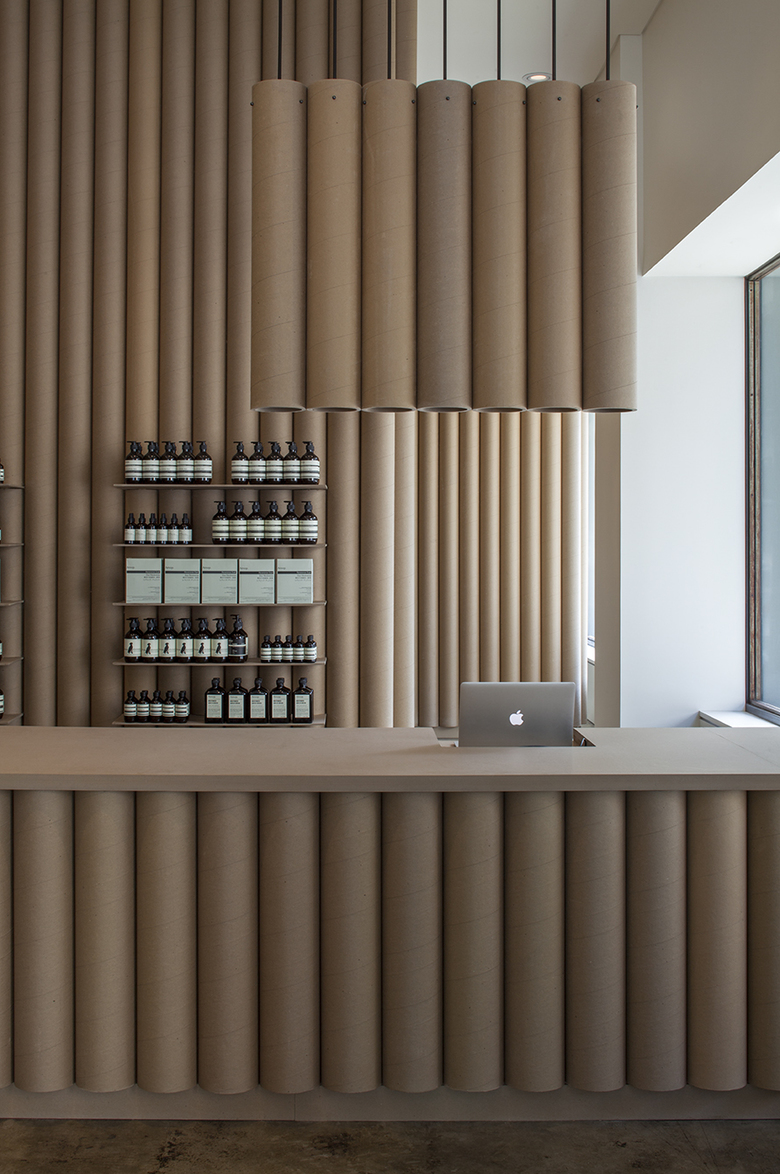 Taking cue from the neighborhood culture and the empty bolts of fabric strewn about costume shops and fashion houses, the environment consists of 6-inch round cardboard tubes to create walls and furniture. This natural palette is warm and inviting, projecting a soft glow to the store’s interior and onto the street and sidewalk. Countertops are made of recycled paper, complimenting the cardboard tube wall finish. Product esting sinks are of a vintage style and floors are the natural concrete of the 1929 historic building. A long storefront captures a view of the busy street and projects a comfortable and unobtrusive space, inviting those outside to enter.
