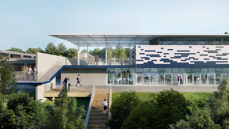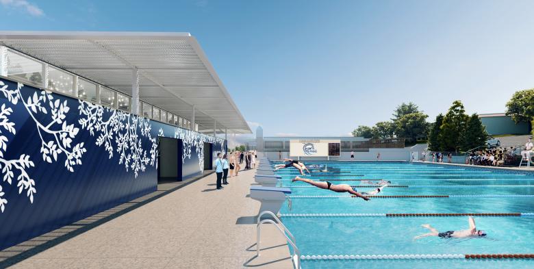 A new replacement High school competition swimming pool located on a hillside. The new complex includes a 75' x 125' pool, locker rooms and offices . Below the pool are additional bathrooms, classrooms, storage, mechanical and multi-purpose spaces.