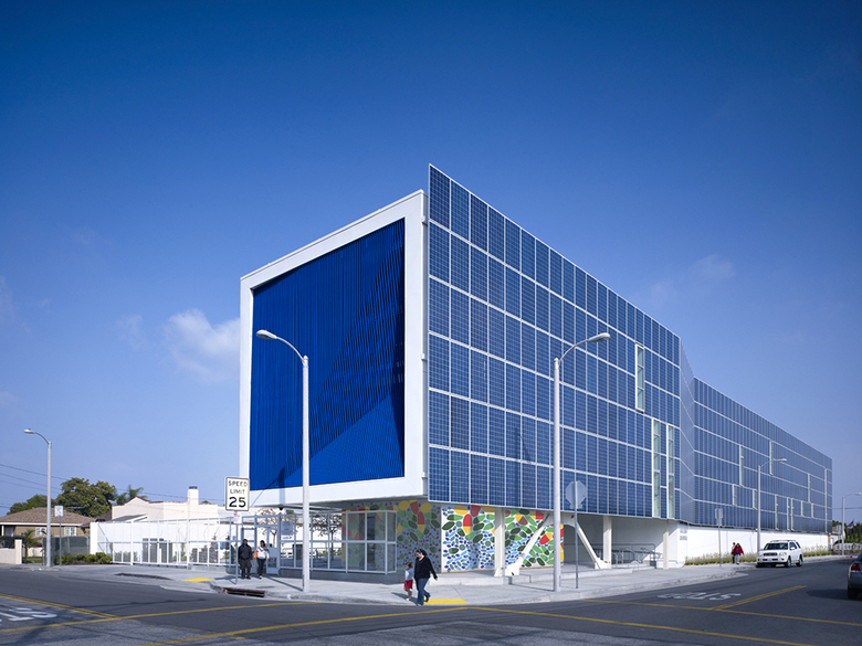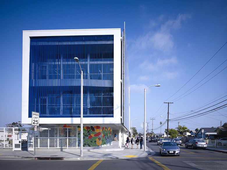 This new public school for 500 students is located in a tough South Los Angeles neighborhood almost directly under the flight path into LAX and adjacent to the very busy 105 Century freeway.  The design was influenced by the New Orleans architects Curtis and Davis who designed and built many schools in the early 1950s in Louisiana.  Their designs adapted to the harsh southern climate without using air conditioning, creating sustainable light filled and poetic spaces for kids to learn.