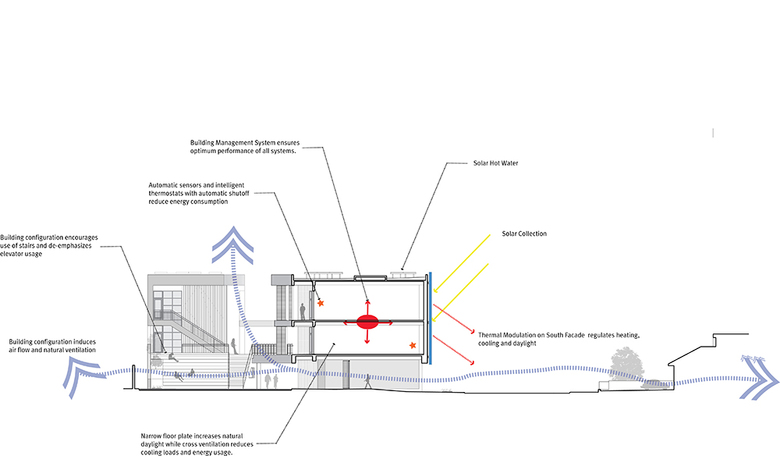 Similarly, this project is designed to enhance passive sustainable strategies.  It allows for abundant natural light, ventilation and view, while shading itself and inducing airflow.  The south facade is clad with 650 solar panels that shade the building and provides 75% of the energy needs for the school. Implementing these strategies will reduce carbon emissions by over 3 million pounds.