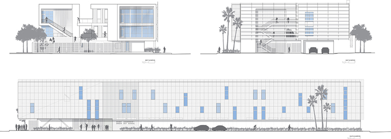 Certified by the Collaborative for High Performance Schools, aesthetics, sustainability, and cost-effectiveness were considered in every design decision. Taking full advantage of the region’s temperate climate, the designers eschewed the fully contained “big box” idiom of conventional schools on the primary use site. Instead, a landscaped courtyard with multifunctional “bleacher” terracing flows into the open-air covered lobby and the multilayered paseo, lending the school the appeal of a collegiate campus and offering significant environmental benefits—improving daylighting and access to fresh air both inside and out—while providing substantial cost savings by limiting artificial lighting and thermal conditioning to the smaller enclosed spaces.