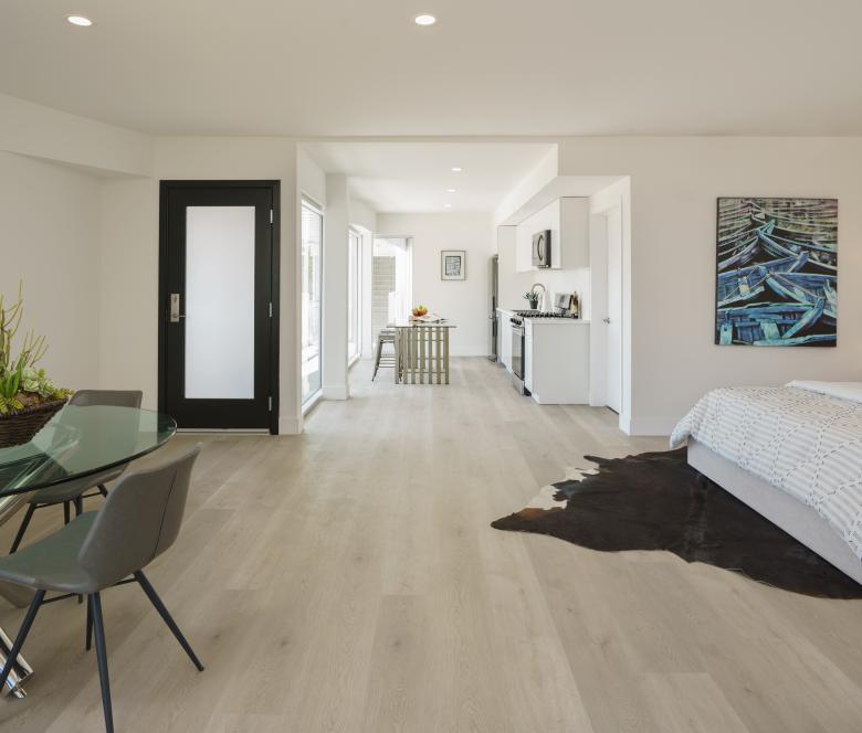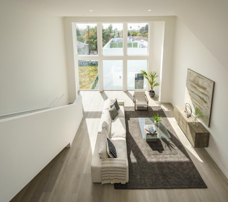 The building form is also shaped to create a light filled courtyard on the second level providing residents with a secure and welcoming surrounding while connecting directly to the street below. Exterior walkways eliminate the need for climate-controlled circulation, while allowing for cross ventilation and ample daylight from a multitude of directions. Large areas of glazing and operable window maximize daylighting and optimize building performance. Indoor air quality was emphasized by minimizing off-gassing. Formaldehyde-free MDF cabinetry, no-VOC paints, natural linoleum, and LED lighting were used to minimize pollution from materials. These details, coupled with the qualities and character found throughout, distinguish this project from similar projects and benefit not only each individual resident but also the community at large.