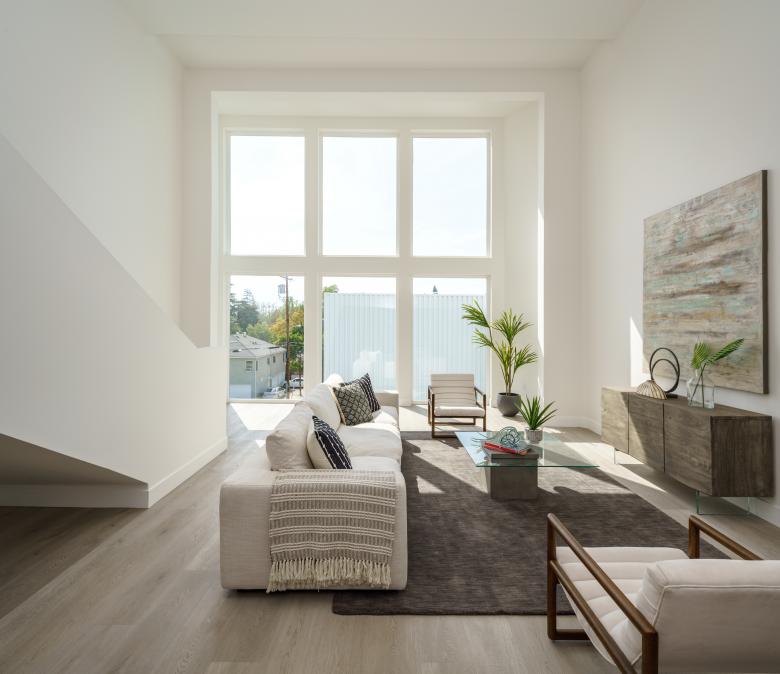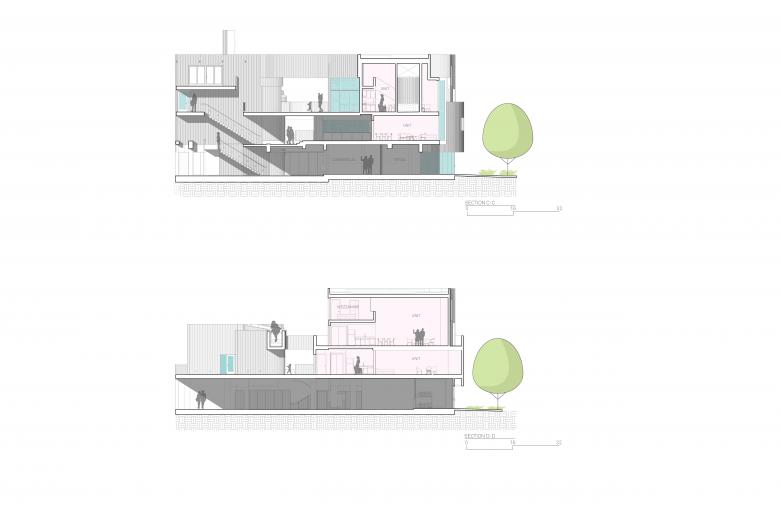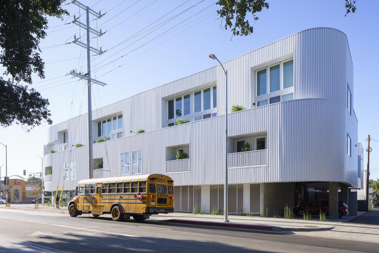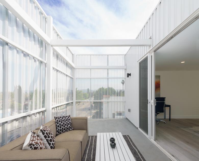 This 19-unit mixed-use multi-family building includes three stories of flats and double-height mezzanine loft apartments, as well as 1600 square feet of retail on the ground floor. The site of a former gas station has been transformed into a model for more compact, responsible urban living. The permeable layers of the perforated aluminum façade creates an ever- changing screen that sparkles in the sun and glows at night, while simultaneously providing shade to cool the building, reducing noise, enhancing privacy, and still allowing for spectacular views, great natural light and ventilation from prevailing breezes which pass through its millions of perforations. The material reappears as a strategic arrangement of screens on the east, west and north-facing walls, lending a subtle rhythm to the exterior circulation while filtering direct sunlight thru the façade. This lends unexpected visual depth, enhancing the structure’s geometric texture. Its unique architectural form and integrated function creates a high-performing building that is an expression of the people who live there and the environmental and cultural context in which it is built.