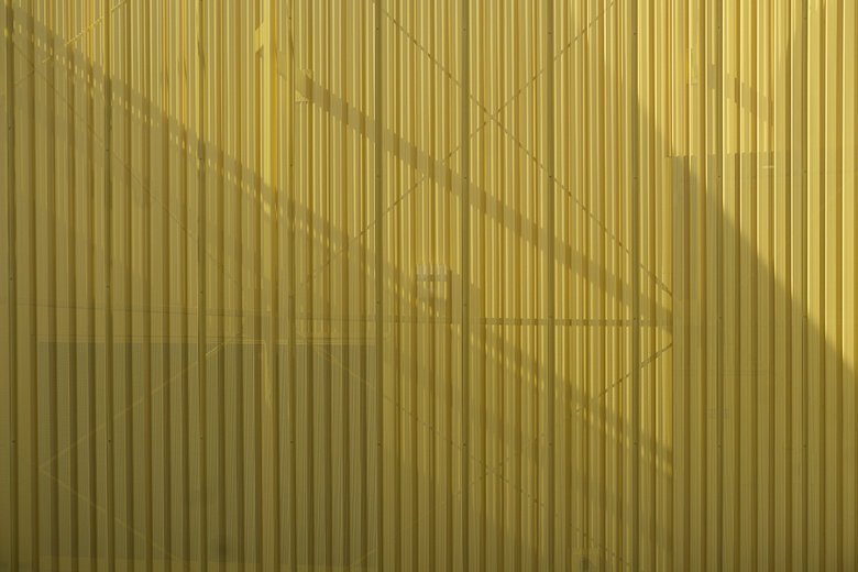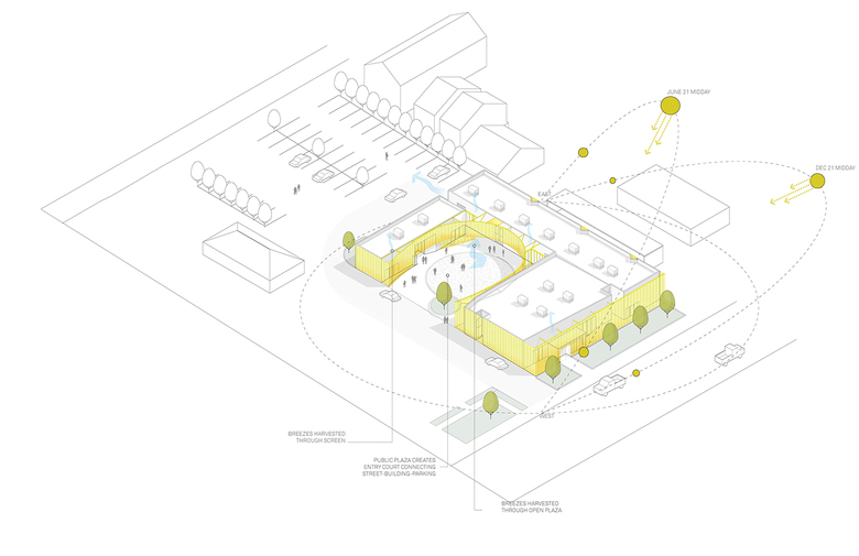 The perforated anodized aluminum façade panels of the building creates an ever- changing screen that sparkles in the sun and glows at night, while simultaneously providing shade to cool the building, reducing noise, enhancing privacy, and still allowing for views, great natural light and ventilation which pass through its millions of perforations. The material reappears as a strategic arrangement of screens around the building, lending a subtle rhythm to the exterior circulation. The walls filter direct sunlight that lends unexpected visual depth while creating a sense of security for the occupants. Enhancing the structure’s geometric texture, the irregular array of openings variably extrudes from the building’s surface. Its unique architectural form and integrated function creates a high-performing building that is an expression of the people who live there and the environmental and cultural context in which it is built.