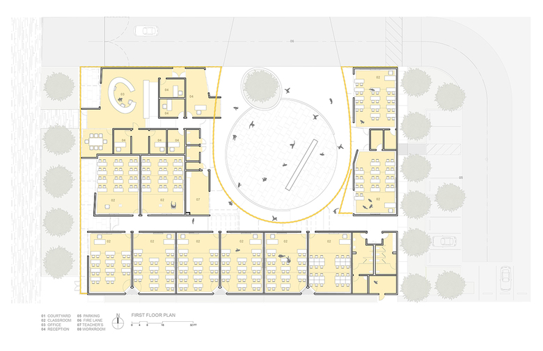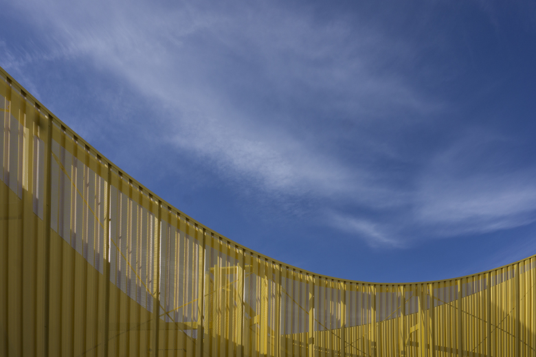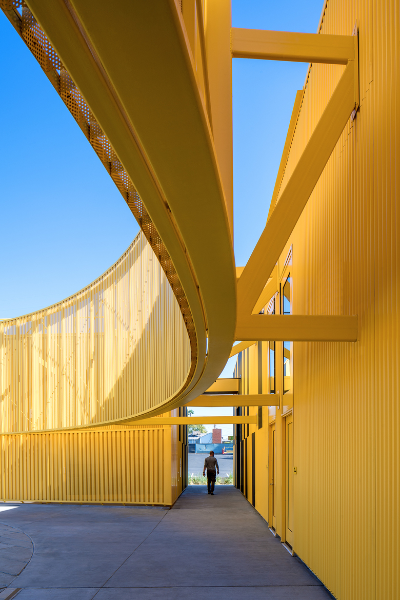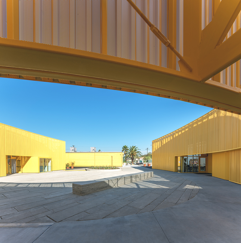 Unlike most school that are enclosed by a property line security fence, the South Los Angeles High School building is surrounded by a 20 foot high perforated bullet resistant metal walls that are integrated into the building design. This creates light filled courtyards for outside activity that is connected directly to classroom activities. This arrangement of courtyard design allows the building to breathe fresh air and daylight while providing a safe and secure environment for leaning and social engagement. Open-air light-filled halls and classrooms, as well as the building transparency, express the school’s values and provide a healthy, sustainable learning environment. The building form and primary courtyard are formed by a series of required clearances around an oil well abandoned in the late 1970’s, a series of power line and utility easements, height restrictions and zone changes running through the site that constrain the form and size to it’s maximum possible building area envelope.