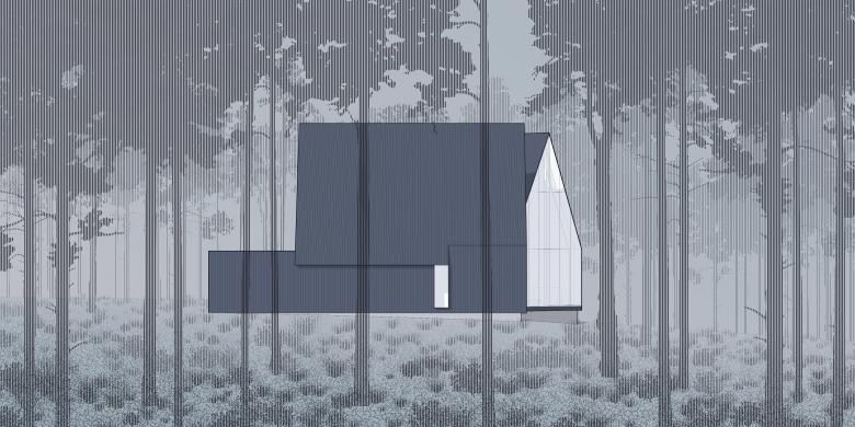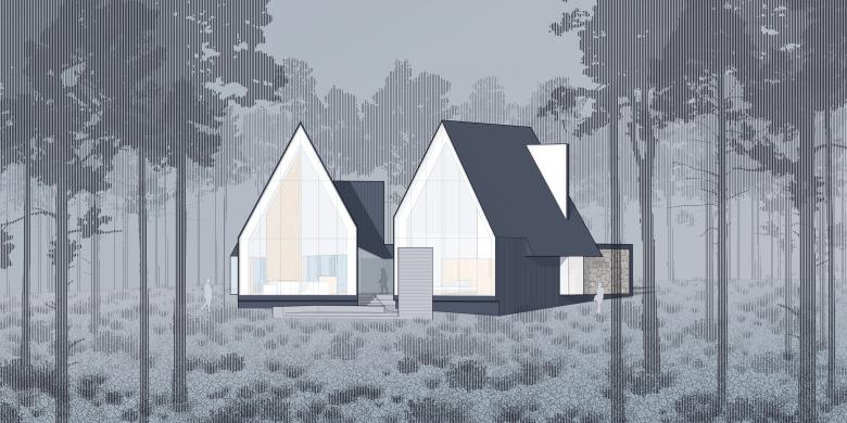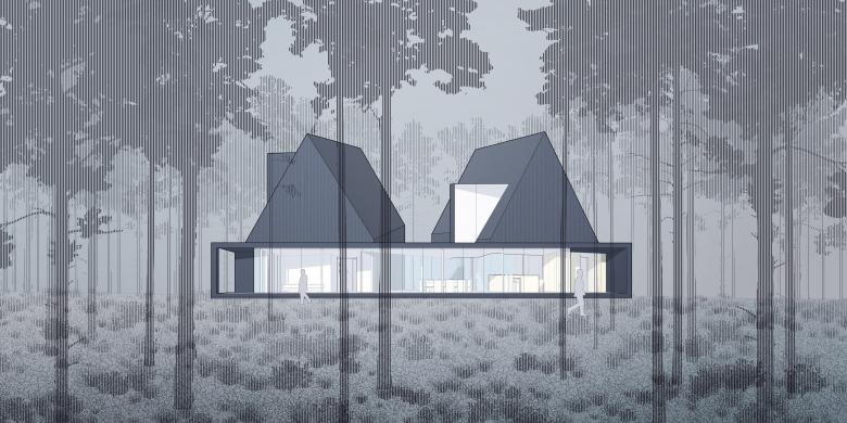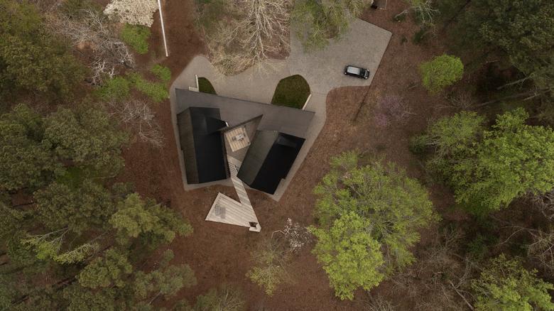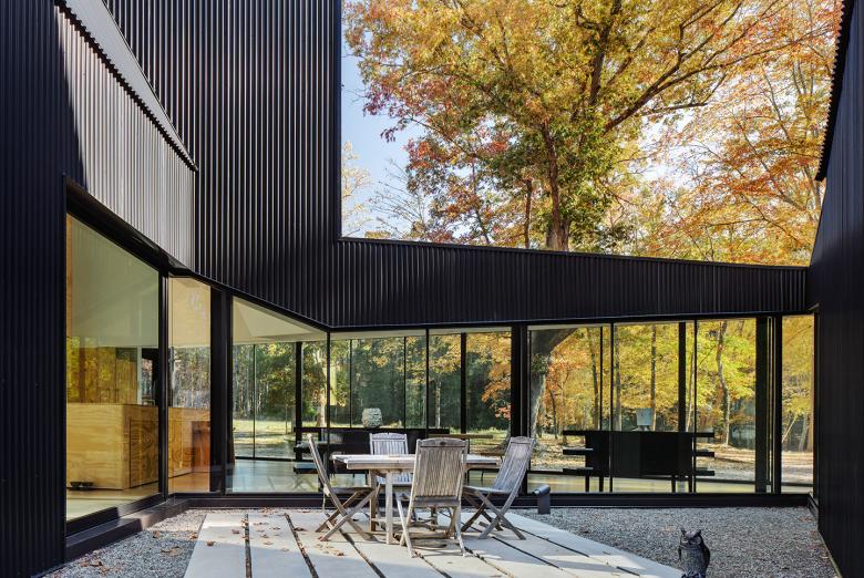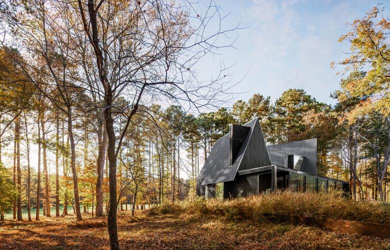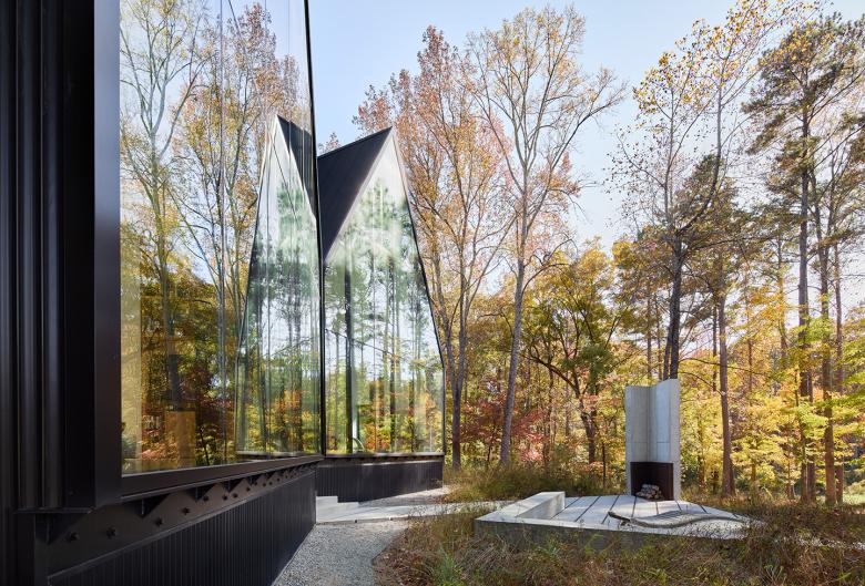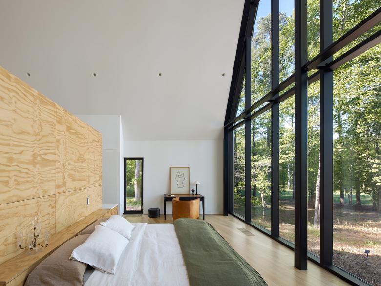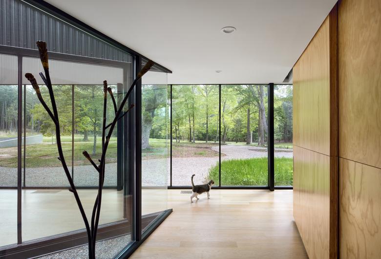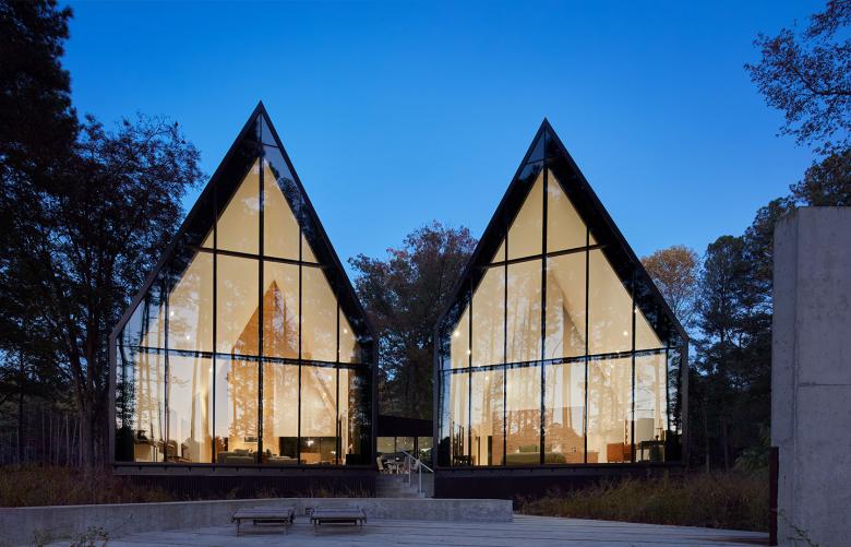 Located on a wooded 65-acre site in the Appalachian foothills near the Eno river around Raleigh Durham, NC, the Steeplechase house is designed as a place of reflection and repose – a pavilion amongst the trees that connects to the expansive natural setting. The simple double gable roofs rise to 31 feet high with expanses of glass that allows nature to visually connect to the interior space and help forge a deeper, more meaningful understanding of the relationship between the natural and built environments.