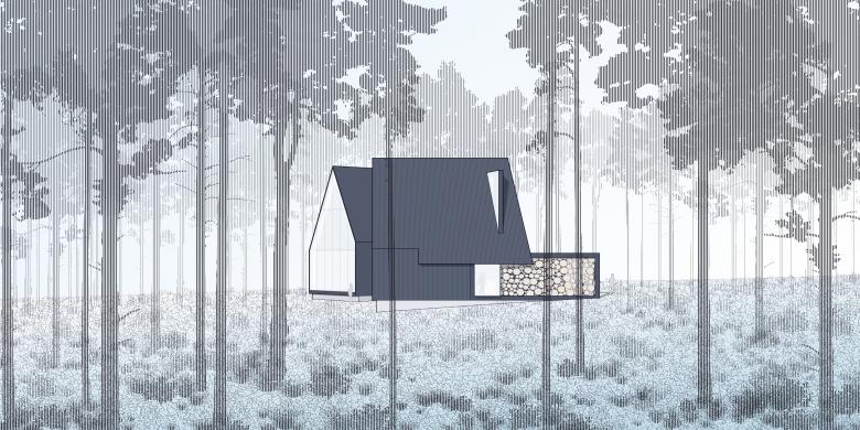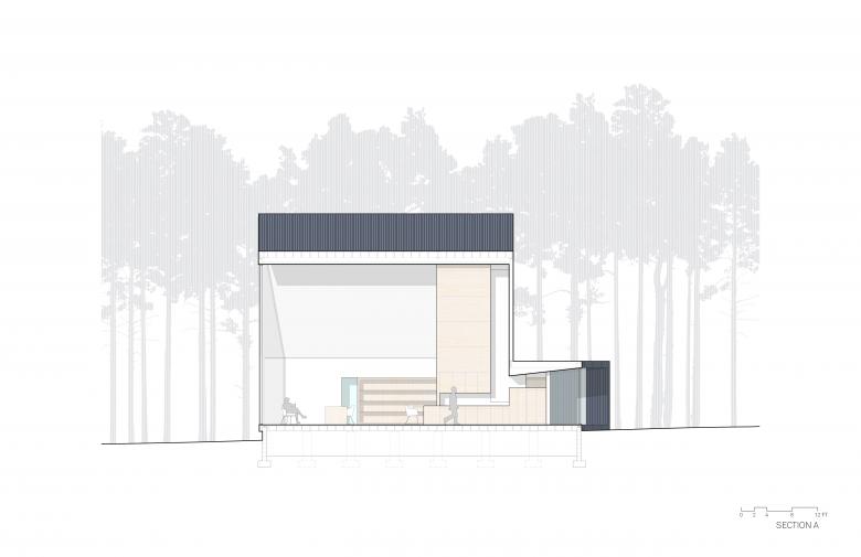 The structure’s reflective glass and black metal exterior give the building an ever-changing presence during the seasons; receding into the forest‘s dappled light in the summer and winter stalk-like tree structures and standing out like a beacon with the occasional winter snow, while the natural plywood interior create a protected and warm gathering place, while preserving the spectacular view into the forest.