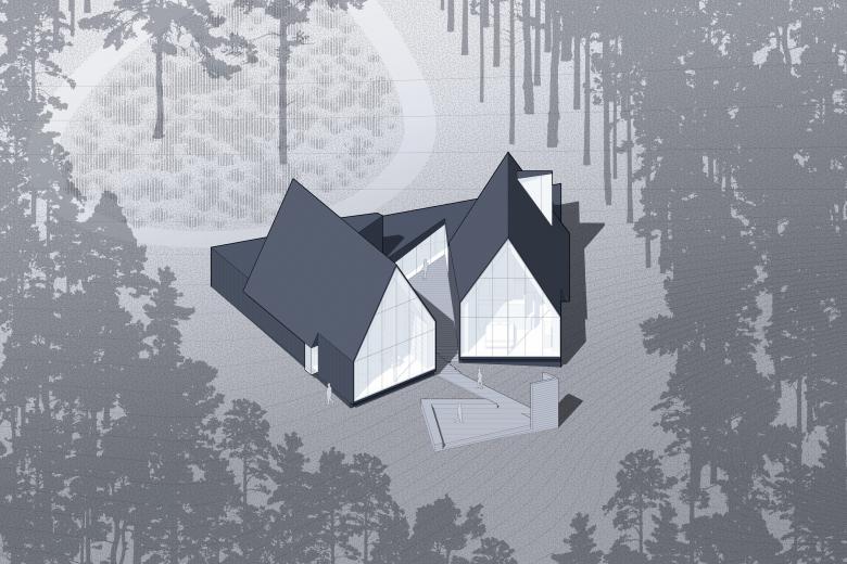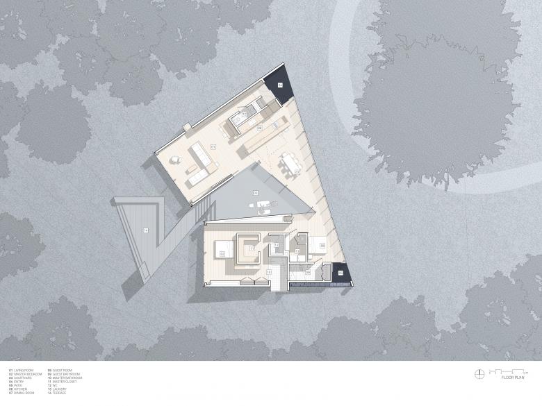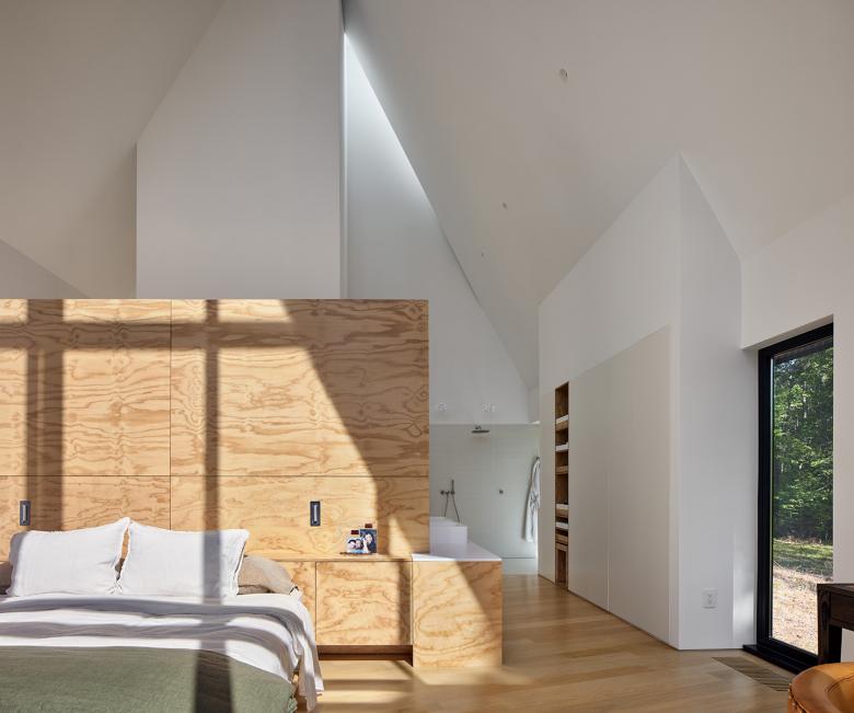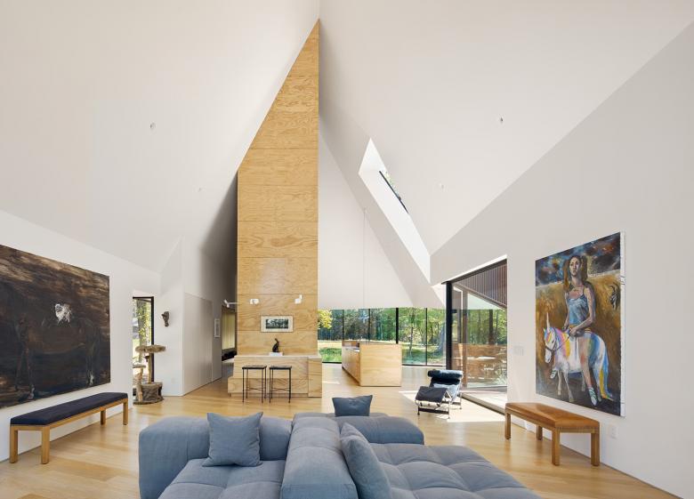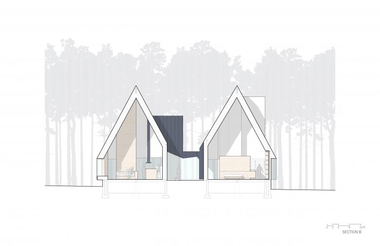 The plan is organized around two open gabled volumes for the public and private zones of the house. The kitchen/dining area connects the two sides of the house with a transparent lower scaled gallery like loggia with glass on both sides that feels like a walk in the forest when moving between the two volumes. This transitional space divides and connects the two distinct zones of the house while allowing a sense of spaciousness and escape.