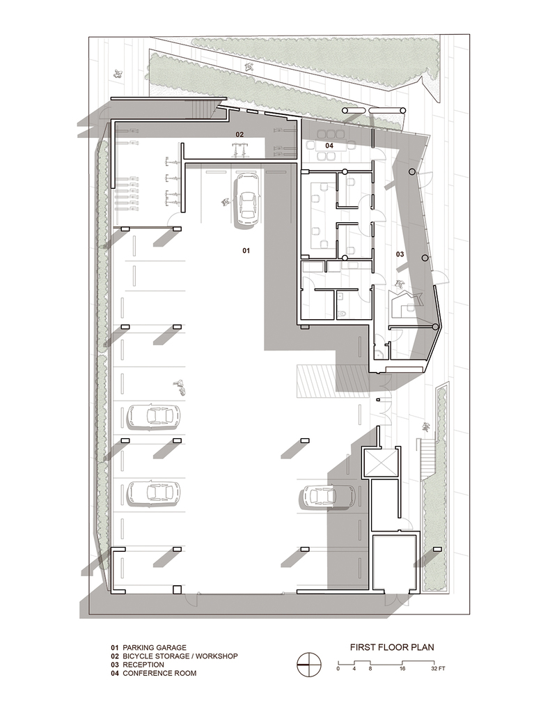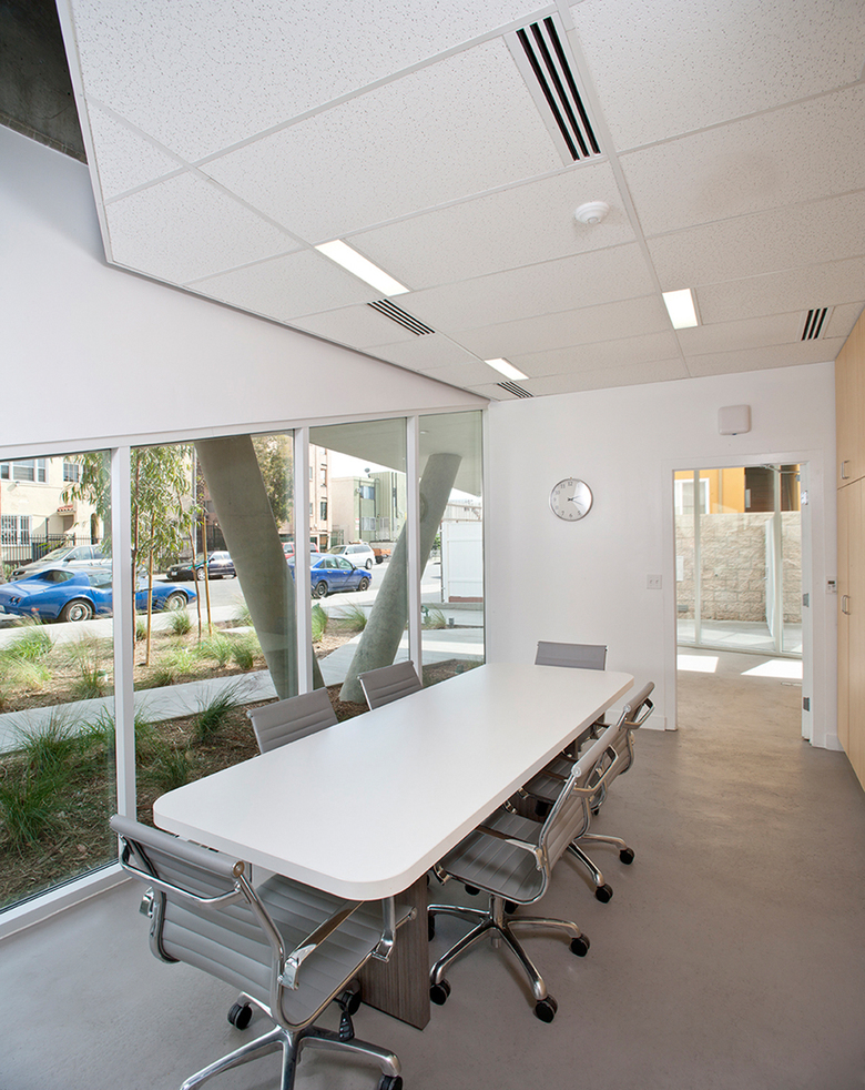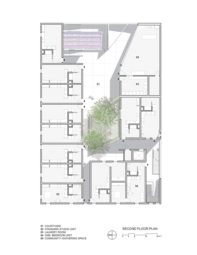 The ground level contains offices, support spaces for the veterans, bike storage and parking while the second level has a large public courtyard. Surrounded by four levels of housing units with balconies wrapped with a wood screen made from recycle planking the courtyard has large openings with green roofs that visually connects the space to the street on the lower level beyond. This allows the tenants to enjoy a secured open space while still connecting to the larger community.