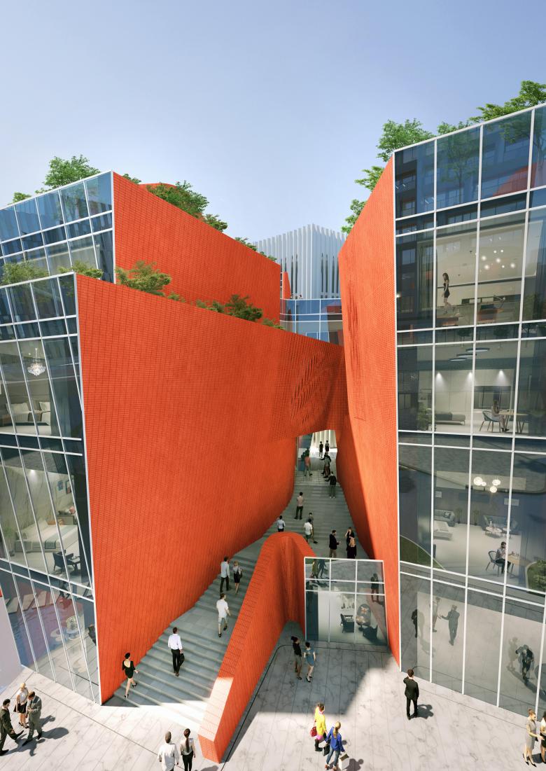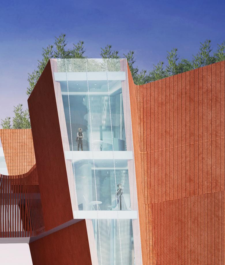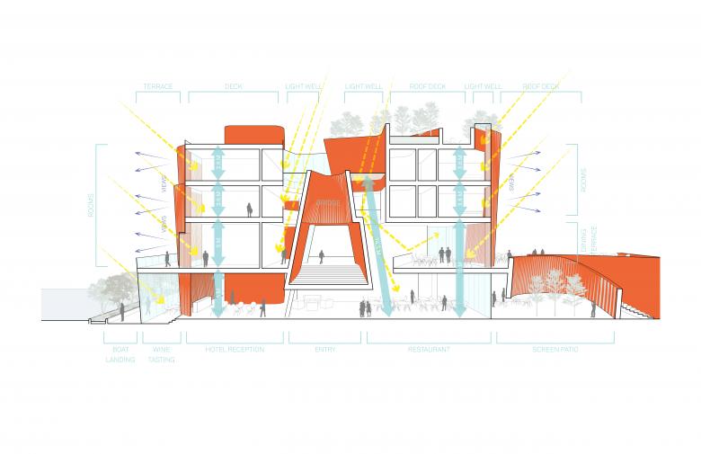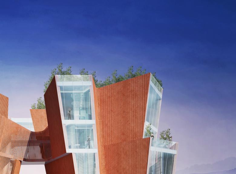 Y4 Boutique Hotel is a small 24 room luxury hotel. It features a world class wine bar and tasting room, a 5 star restaurant and bar, private meeting rooms and event spaces with courtyards and plazas. The hotel rooms range from 40m2 to 60m2 suites with private courtyards and balconies with panoramic views of the surrounding area. The building features a facade constructed of traditional Chinese brick. However, the brick is organized to create an every changing pattern of opening and closing. The facade appears to move as the viewer passes by the hotel. This also creates privacy screens of brick that allow ample views while allowing light to pass thru the brick screen.