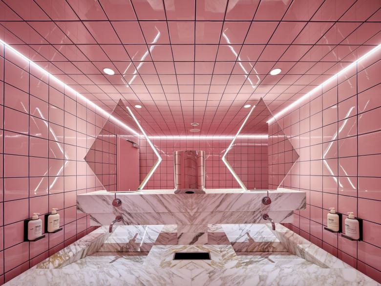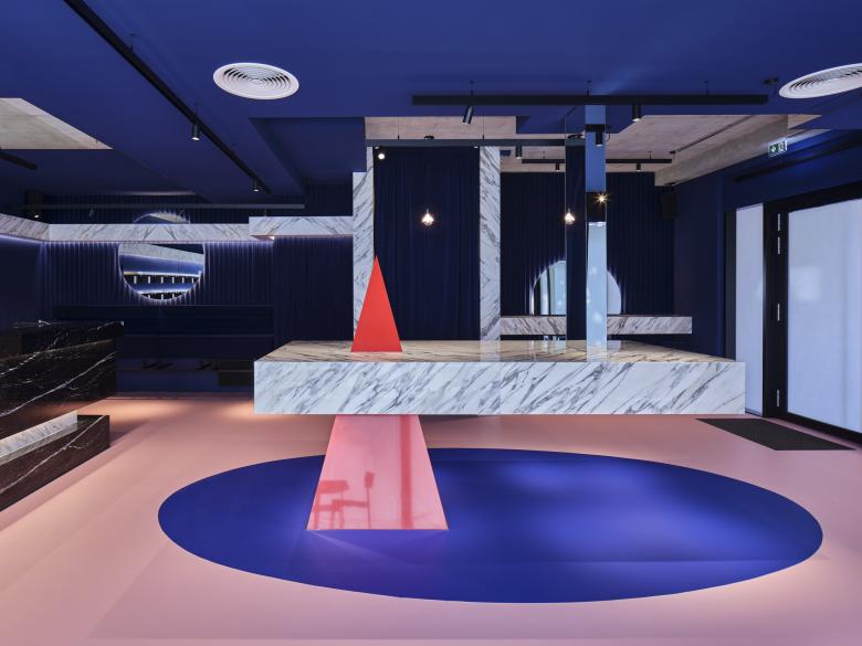 Die Einrichtung im GPeM setzt mit weißem und schwarzem Marmor, einem roten Kegel sowie kobaltblauen Wand-, Decken und Bodenflächen auf intensive Kontraste. Diese werden durch eine indirekte Beleuchtung aus Fugen, hinterleuchteten Flächen und dem ausgewählten Akzent-Licht verstärkt. Ihren Höhepunkt erreicht die Inszenierung des Ortes in den Sanitärräumen, scherzhaft auch die »rosa Hölle« genannt: Die gewählte Beleuchtung zeichnet die Raumkubatur nach, indem sie den Wand- und Spiegelkanten folgt. Dabei werden vielfältige Lichtreflektionen und -spiegelungen auf den Fliesen hervorgerufen, die zu einer bewusst erzeugten Raumirritation bei den Besuchern führt. Ein neuer Selfie-Hotspot ist entstanden, der – zumindest in Stuttgart – seinesgleichen sucht.
