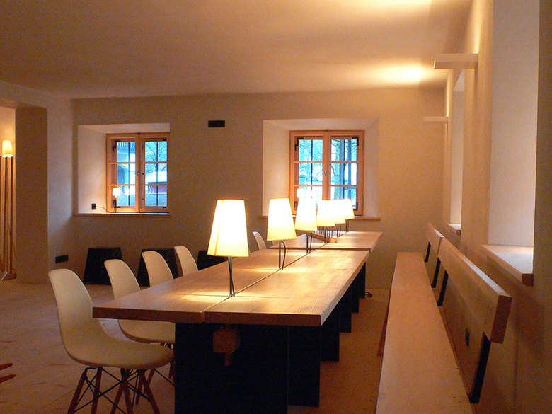Bergbude, Gipfelstürmer, Liftstube oder Straßenfeger – wer hier noch nicht seinen persönlichen Übernachtungstempel gefunden hat, kann wahlweise auch im Sommerloch, Basislager oder Gartenglück absteigen. Zu den Inklusivleistungen im Gästehaus Berge zählen auch Leih-Bücher, Leih-Fahrräder zum Semmelholen und Leihschlitten inklusive Leih-Stirnlampe. Allen Gästezimmern und -wohnungen gemein ist das mit Feinsinn und Humor ausgewählte Interieur – das trotz Anlehnung an bayerische Traditionen keineswegs bieder und volkstümlich wirkt. In diesem Sinne durfte auch die Beleuchtung eher „zünftig“ ausfallen: gewählt wurden rustikal Archetypen, ohne ausschmückende, überflüssige Details.