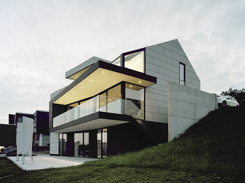 Eine strenge Kubatur, unbehandelter Sichtbeton, helle Flächen und rahmenloses Glas – Haus M stellt einen formvollendeten Vertreter des modernen Wohnens dar. Zur Straße ist die Fassade des puristisch anmutenden Neubaus streng verschlossen, zum Tal hin öffnet sie sich großzügig über zargenlose Fensterfronten. Das gewählte Lichtkonzept unterstützt die Kubatur der klaren, fast asketisch anmutenden Architektur. Die Beleuchtung nimmt sich bewusst zurück und ist entlang Raumkanten und Einbaumöbeln in Fugen untergebracht. Auf dekorative Leuchten wurde bewusst verzichtet.