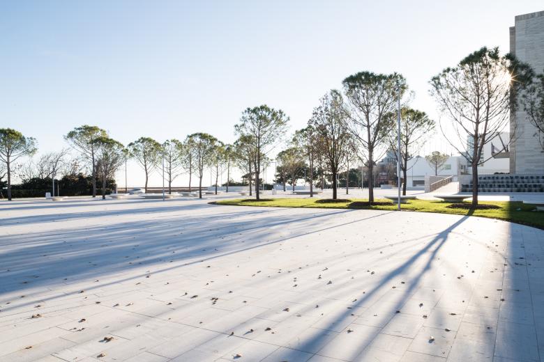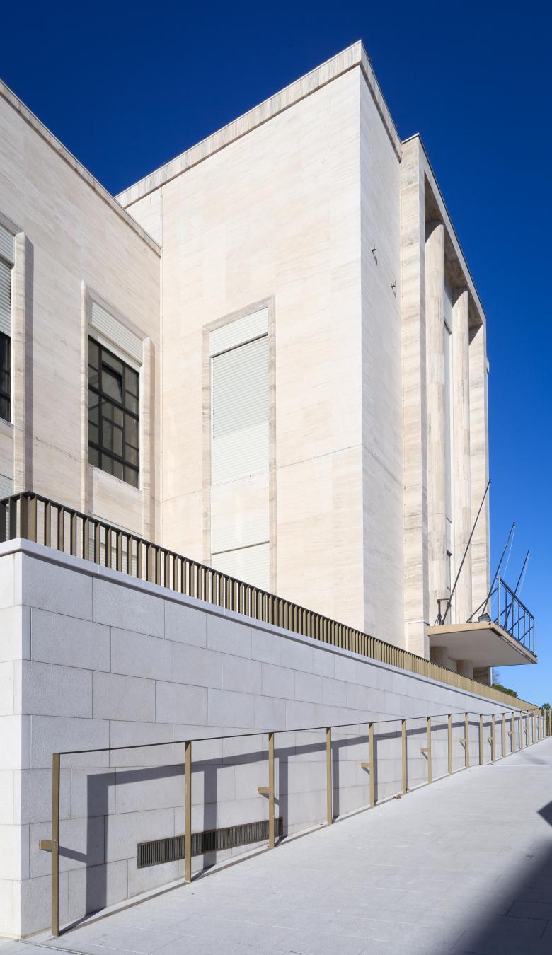 The task of the Piazza was also sewing together the heritage pieces (the two Palaces and the park), the latter being for us as important as the buildings as home to animals and enriching the biodiversity of the site. A carpet of white Apricena stone is laid among the buildings and the green and designed to highlight the curves of a never built third building, manipulated to be accessible to all or punctuated by precious insertions such as the brass railings, special surface treatments or gutters for water collection. Sustainability solutions are enhanced for water collection, reforestation of local trees.