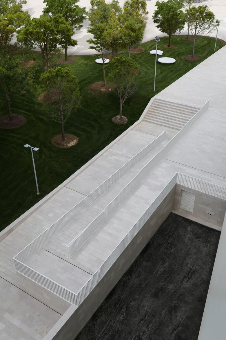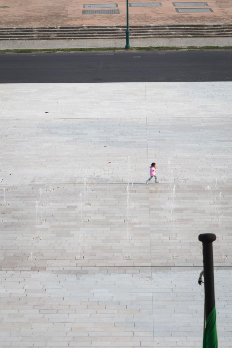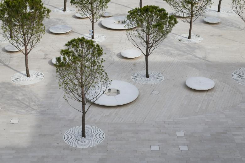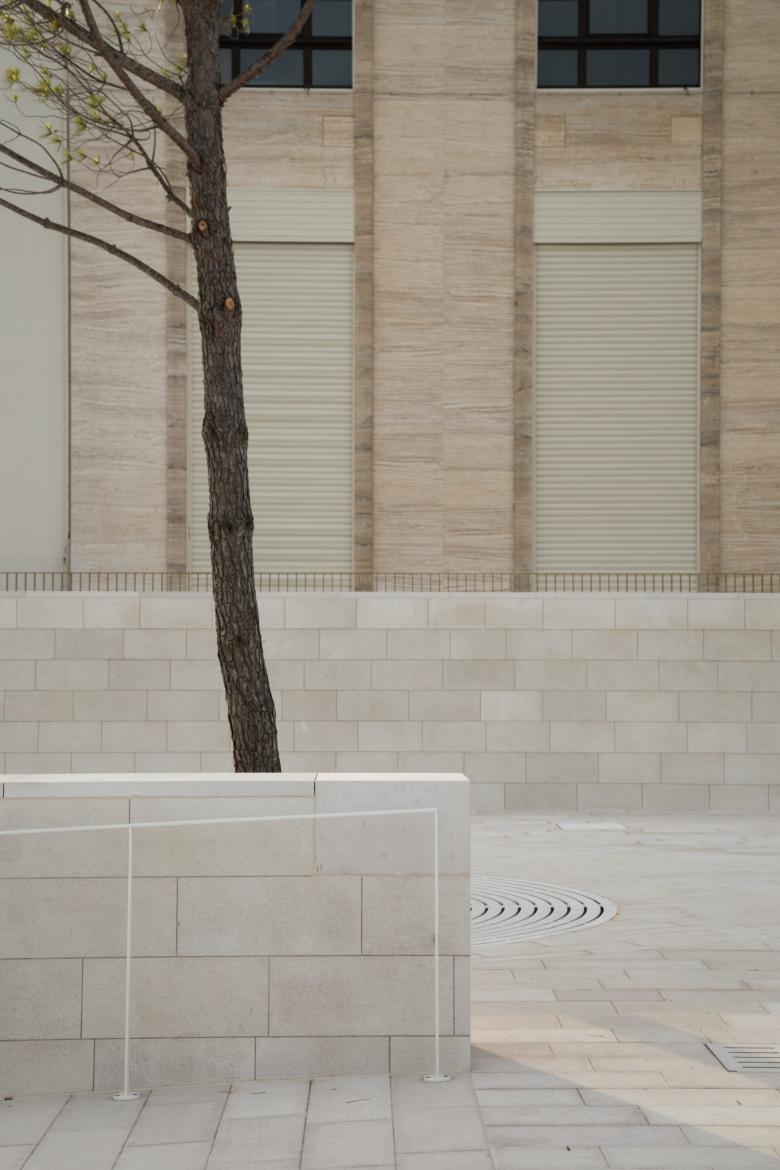 The design of the materiality of the rolled or sanded pieces of the stone, the water drainage system and the fountain - designed as thin cuts and shadows on the white surface of the stone, the brass or varnished steel railings, the benches in reconstituted natural marble stone, the treatments for disabled and visually impaired people, the newly planted and autochthonous maritime pines and the sinuosity of the garden- which is designed as a symbol of a third building which was meant to complete the square but was never built: all these element are designed as accents in the continuity of the monochrome materiality, vibrating to the light and changing every single moment of the day and of the year.