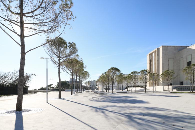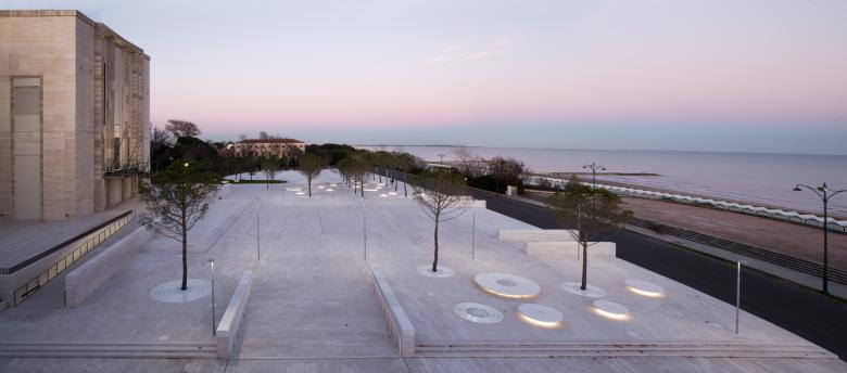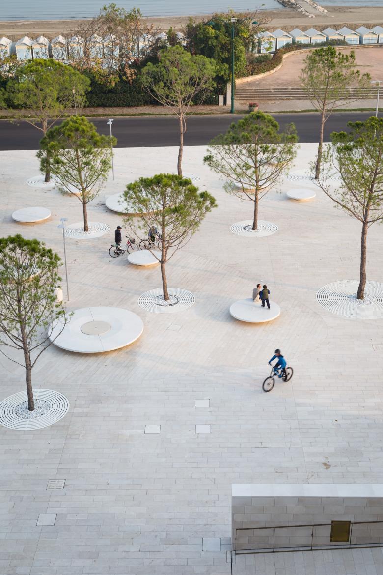 The square is heightened from the original level to allow the view of the sea and is entirely designed using the monochrome Apricena stone. The use of a monochrome surface for the whole public space confirms and underlines the strengths of the dimension of the public space, avoiding the fragmentation of the use of different materials.