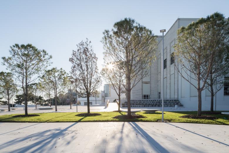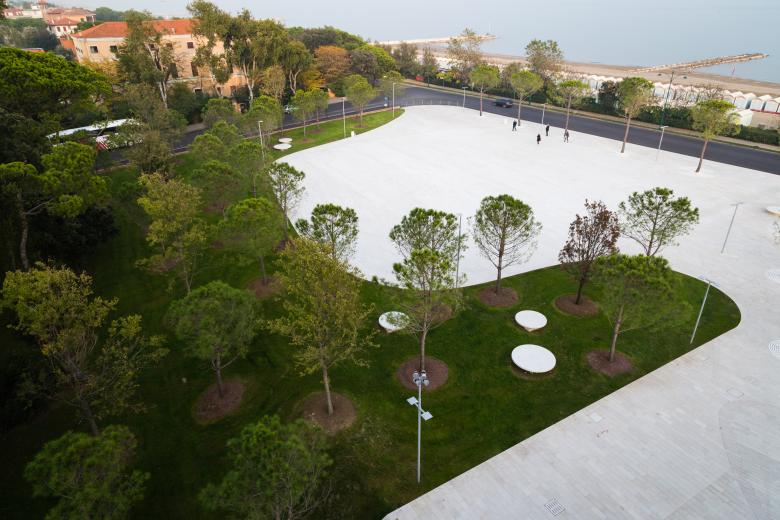 The square, designed on the aim to serve the Venice Cinema Festival, is invisibly infrastructured to potentially allow the activation of events during the other months of the year, but especially to give back a free public space to the inhabitants of the Lido island: mums with prams, skaters, kids playing with the water fountain, old people relaxing under the shadow of the trees and watching the sea.
