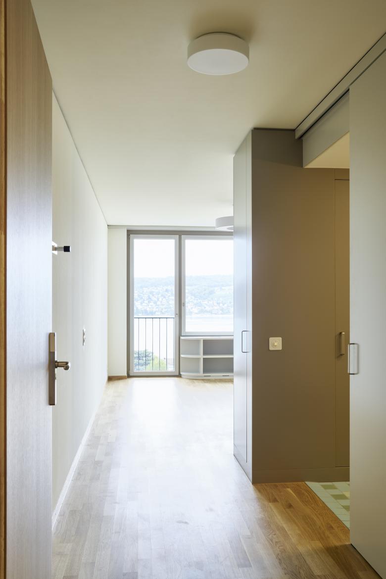 In den oberen Etagen ist auch hier der Übersichtlichkeit und Orientierung der BewohnerInnen durch die klaren räumlichen Zuordnungen grosse Beachtung geschenkt worden. Ausblicke ins Quartier, ruhige Begegnungszonen, und kurze Erschliessungsbereiche unterstützen diese Anforderungen. Die leicht konische Geometrie verkürzt optisch die Korridore und die Türnischen der Zimmer rhythmisieren die Erschliessung. Die Zimmer sind zweckmässig gestaltet und zeichnen sich vor allem durch das Panoramafenster aus.