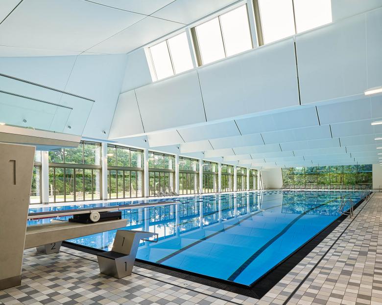 Auf der Süd- und Westseite ist das Schwimmbad überwiegend verglast und gibt den Blick in den Land­schaftsraum des Alsterparks frei. Die gläserne Südfassade lässt sich zu großen Teilen in Richtung Terrasse und Liegewiese öffnen. Der fließende Übergang vom Innenraum in die großzügige Außenanlage verleiht der Anlage den Charakter eines Freibades.