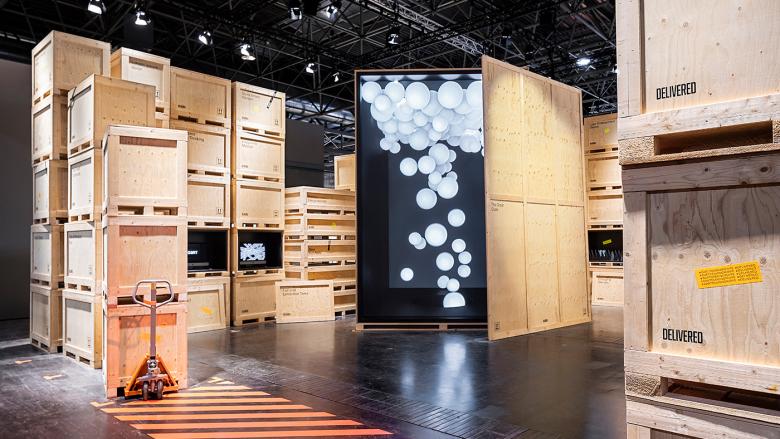 Das Projekt macht zunächst einen ungewohnten Eindruck. Zwischen all den konventionell gestalteten Messeständen ragt eine riesige Kistenburg hervor. Die Kisten sind Crates. Der gemeinsame Nenner im Messebau, der heimliche Held jeder Ausstellung – und für den Besucher doch unsichtbar, weil sie zur Eröffnung stets von der Bildfläche verschwunden sind.