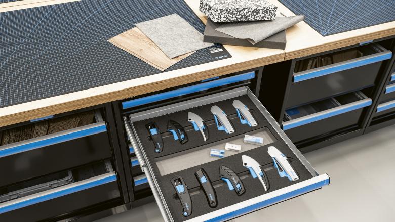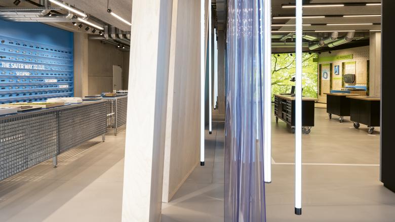 Die Nähe zum Kunden hat für MARTOR einen besonderen Stellenwert – so greift das Konzept die Ästhetik und Materialien aus dem Arbeitsumfeld auf, in dem die Sicherheitsmesser und -scheren zum Einsatz kommen: in den Werkshallen von Industrie, Logistik und Einzelhandel. Estrichboden und sichtbare Gebäudetechnik, ein transparenter Staplervorhang als Raumteiler, Leuchtstoffröhren, Gittertische, Werkbänke und Lagerregale zitieren die Kundenwelt und gehen in die Showroomgestaltung über.