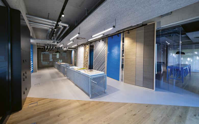 Marken- und Schulungsbereich sind über den Trendbereich verbunden. Dort werden in Wechselausstellungen verschiedene branchenrelevante Trends angesprochen. Aktuell zeigt MARTOR seine Lösungen zum Metathema „Nachhaltigkeit“.