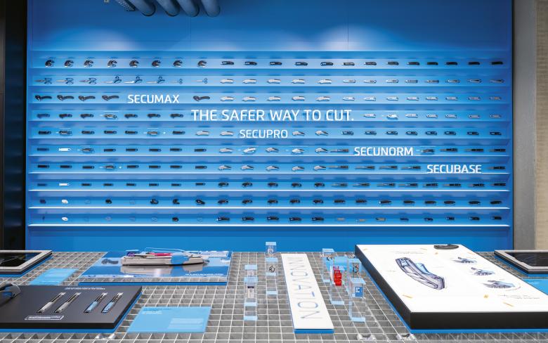 Zentrales Narrativ ist ein 12 Meter langer Brand Value Table. In drei thematische Einheiten – Expertise, Innovation und Service – werden Marke, Produkt und Kompetenz vermittelt. Die Gestaltung und Kommunikation setzen auch hier auf eine analoge und physische Präsentation, wie Handskizzen, Print, anfassbare Ergonomie-Modelle, Spezialklingen in Acrylblöcken. Die collagenhafte Anordnung der Exponate auf dem Gittertisch ermöglicht zukünftige Updates.