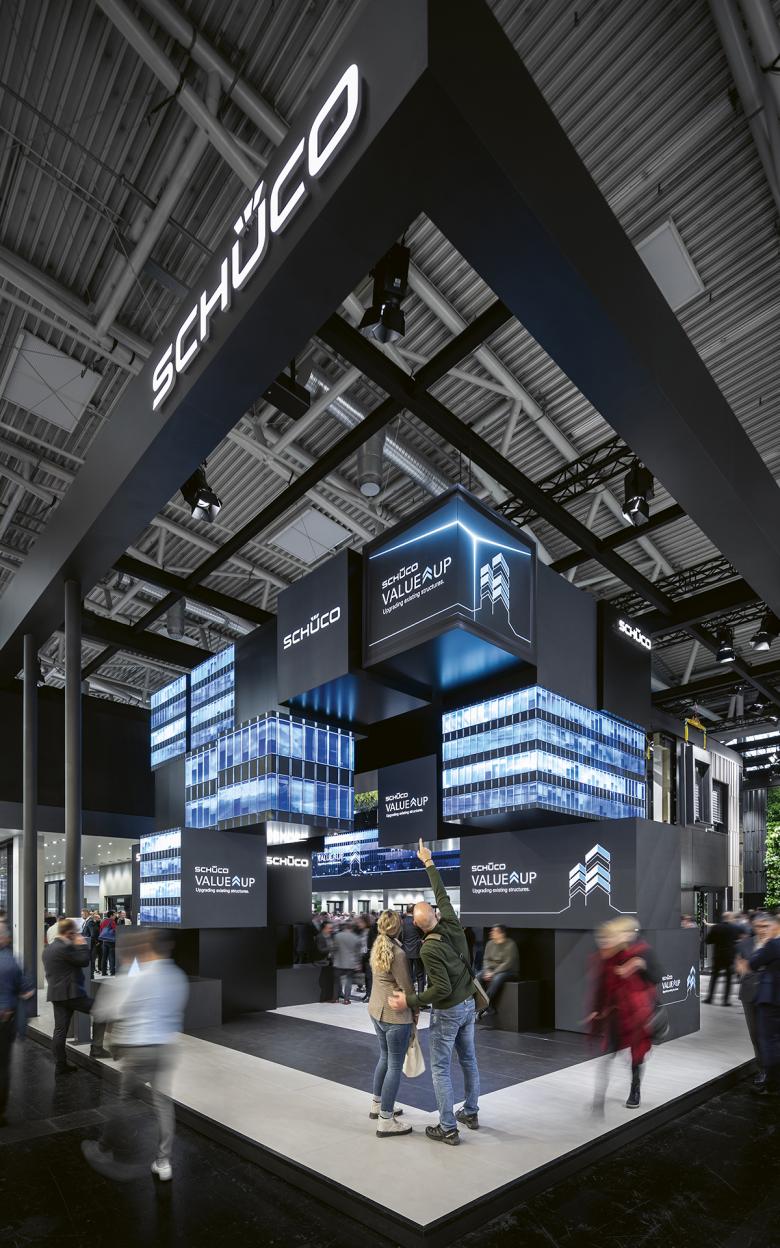 Unser Standkonzept steht im Zeichen des Metathemas Gebäudelebenszyklus. Im Mittelpunkt Schüco Value Up – Bauen im Bestand, das objektspezifische Angebot von Schüco für die individuelle Sanierung von Gebäudehüllen. Bereits am Eingang werden die Besucher von einer aufmerksamkeitsstarken Medienskulptur mit der zentralen Botschaft empfangen. In der Arena – dem großzügigen, offene Innenraum des Standes – wird die Kampagne auf großformatigen Medienflächen fortgeführt. Mit prägnanten Fassaden und zahlreichen technologischen Exponaten zeigt Schüco sein Know-how zum Thema ‚Bauen im Bestand‘.