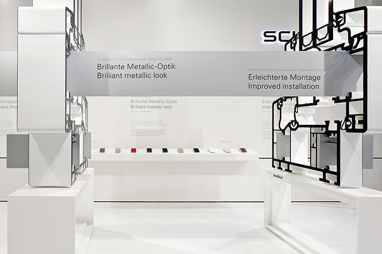 Das Messekonzept begrüßt den Besucher mit einer einladenden, architektonischen Geste: ein weit geöffneter Eingangsbereich lässt tief in den Stand blicken und lädt zu einem Besuch der Schüco Produktwelt ein. Auch an den anderen Außenseiten öffnet sich die Standarchitektur mit großzügigen Blickfenstern und Eingängen und schafft dadurch Transparenz. Gleichzeitig erhält die Architektur eine dynamische Anmutung, die sich im Inneren weiterführt: präsentiert werden hier im Dreiklang Kommunikation, zentrale Inszenierung und Produktexponate. Der gestalterische und konzeptionelle Schwerpunkt liegt auf der Inszenierung des Kunststofffensters „Schüco Alu Inside“, das in der Mittelachse des Standes räumlich erlebbar gemacht wird. Der Eingangsbereich führt den Besucher direkt in den „Experience Walk“: überdimensionale Profilquerschnitte inszenieren hier dramaturgisch in Form einer Ausstellung das Premiumprodukt, das mit seinem innovativen Innenleben Fachbesucher begeistern darf. Insgesamt sechs Profilschnitte werden en detail, makroskopisch auf Ausstellungspodesten präsentiert; rhythmisiert in ihrer Anordnung findet die Darstellung im Zentrum ihren Höhepunkt. Hier werden die Produktvorteile nochmals typographisch aufgearbeitet. Touchpoints an den Wänden ergänzen die analoge Präsentation auf interaktiver Ebene.