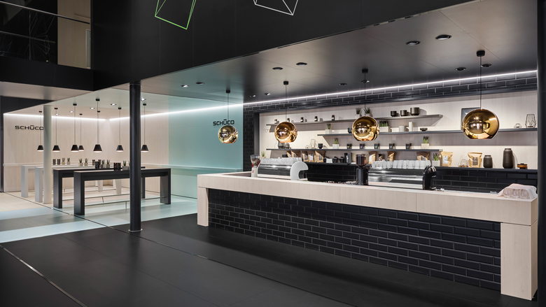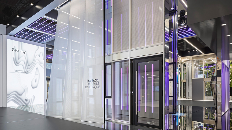 Anhand zweier raumhoher Exponate werden die zentralen Themen Wohnbau und Objekt anschaulich in Szene gesetzt. Zum einen bildet eine Lichtinstallation in Verbindung mit verspiegelten Deckenfeldern eine abstrakte Darstellung vertikaler Dichte und Urbanität. Hängende Gärten hingegen bilden den Kontrast in der zweiten Installation und inszenieren, in Verbindung mit natürlichen Materialien, ein Gefühl des nachhaltigen Wohnens. An dieser Stelle wird für den Besucher emotional greifbar, was Schüco Produkte können und in Zukunft leisten werden.