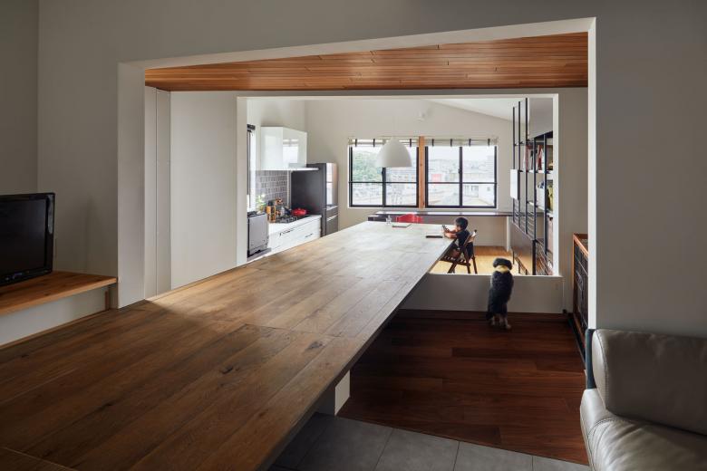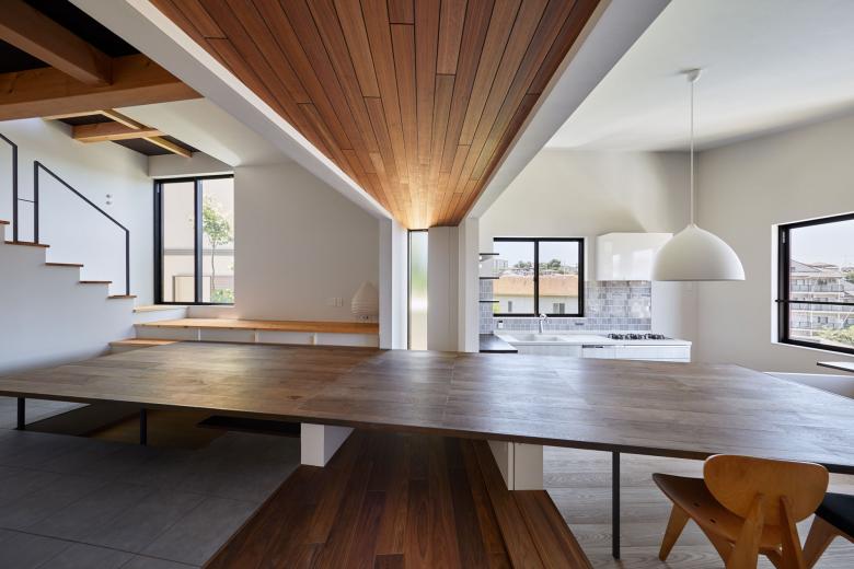 積極的にその擁壁を利用するように高低差のある二つの土地それぞれに小さなボリュームをおき、1階は床のように大きなテーブルで、2階はルーフテラスが2棟を繋いだ。またそれぞれのボリュームは他者が影響し合い、地震の揺れに対する層間変異を許容する工夫が隠されている。