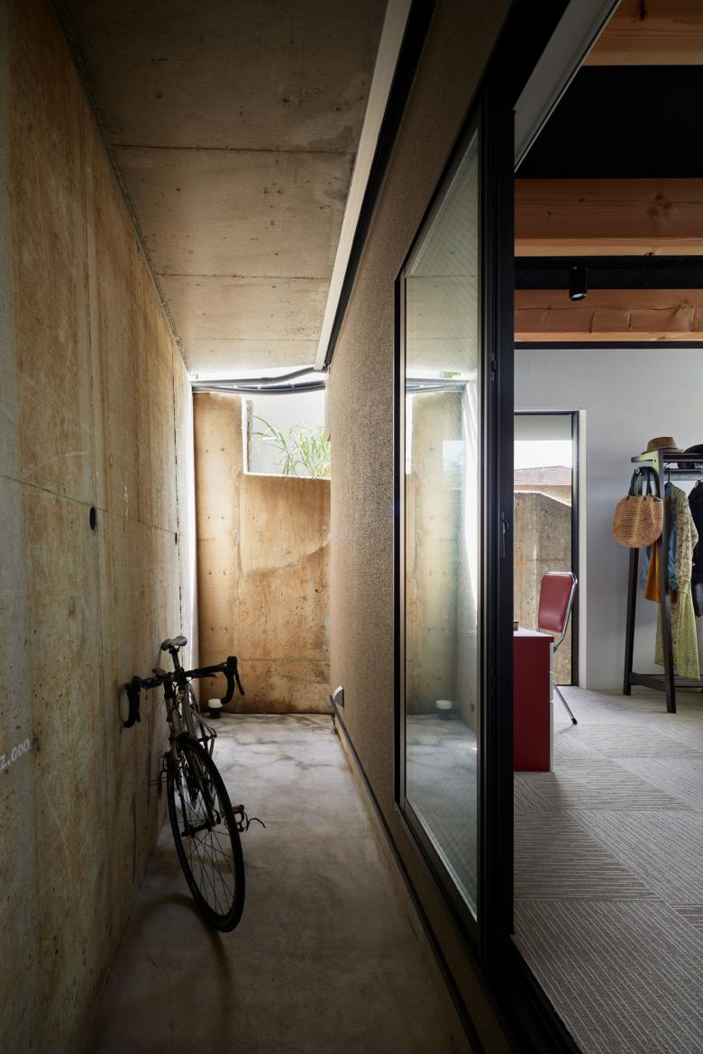 着工後、隣地擁壁の基礎が計画建物内に干渉することが発覚した際にもその基礎を避けるように平面を変更し、結果として擁壁に囲まれた不思議な半外部空間の先に隣地の緑が見え、眺望が広がる変化の富んだ地下空間が生まれた。