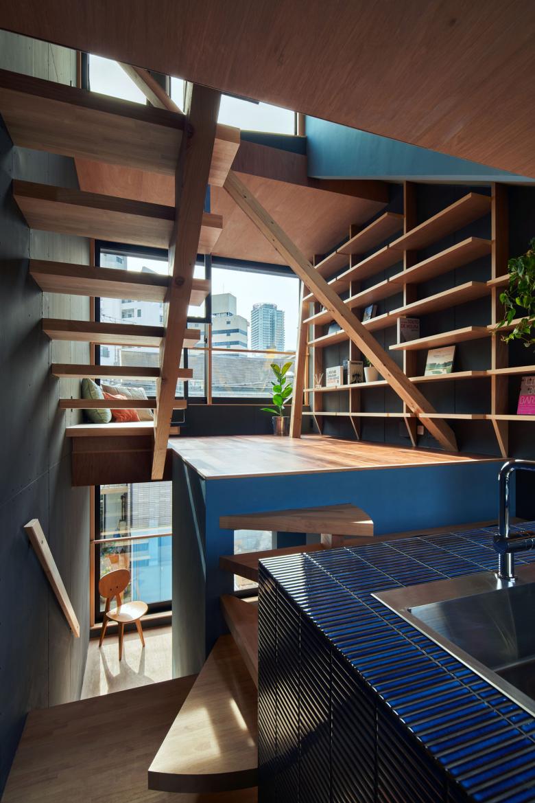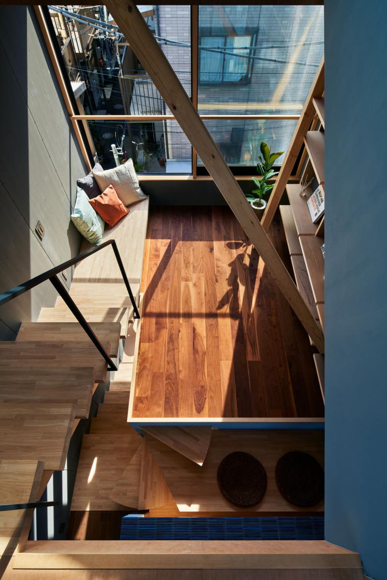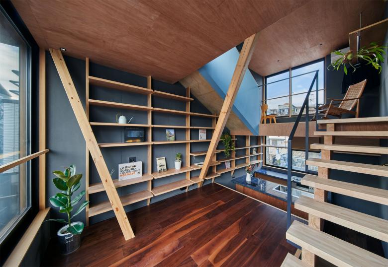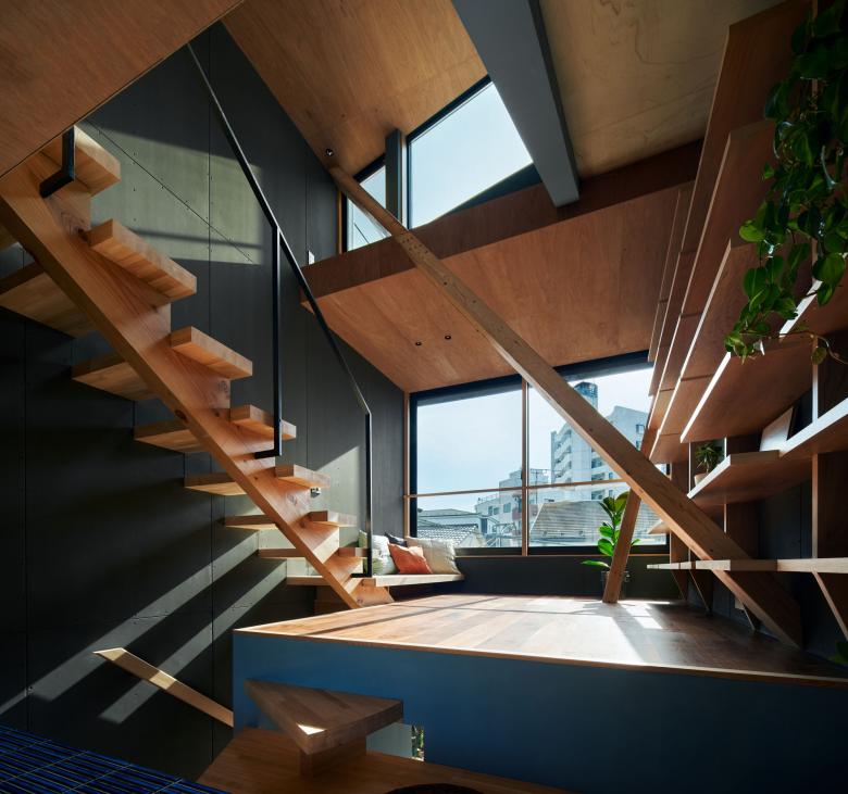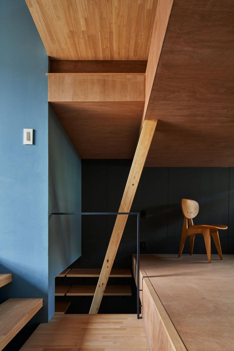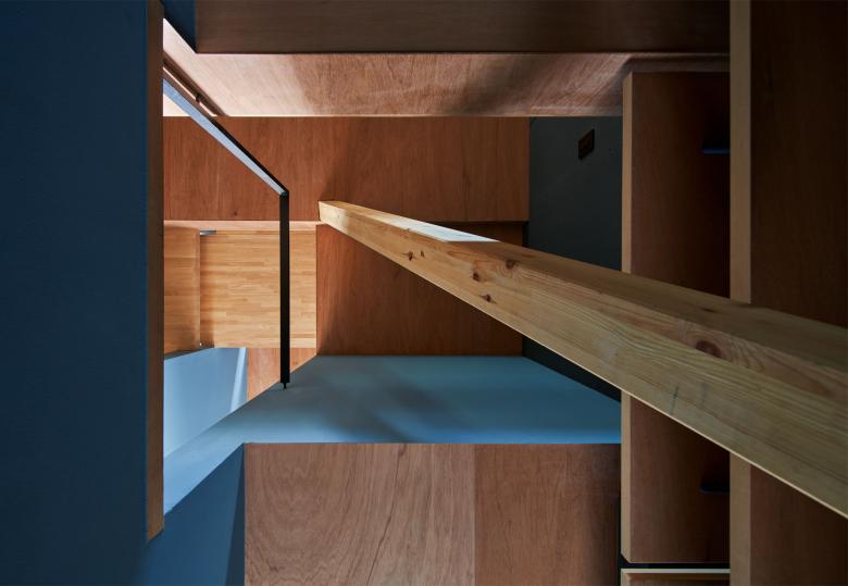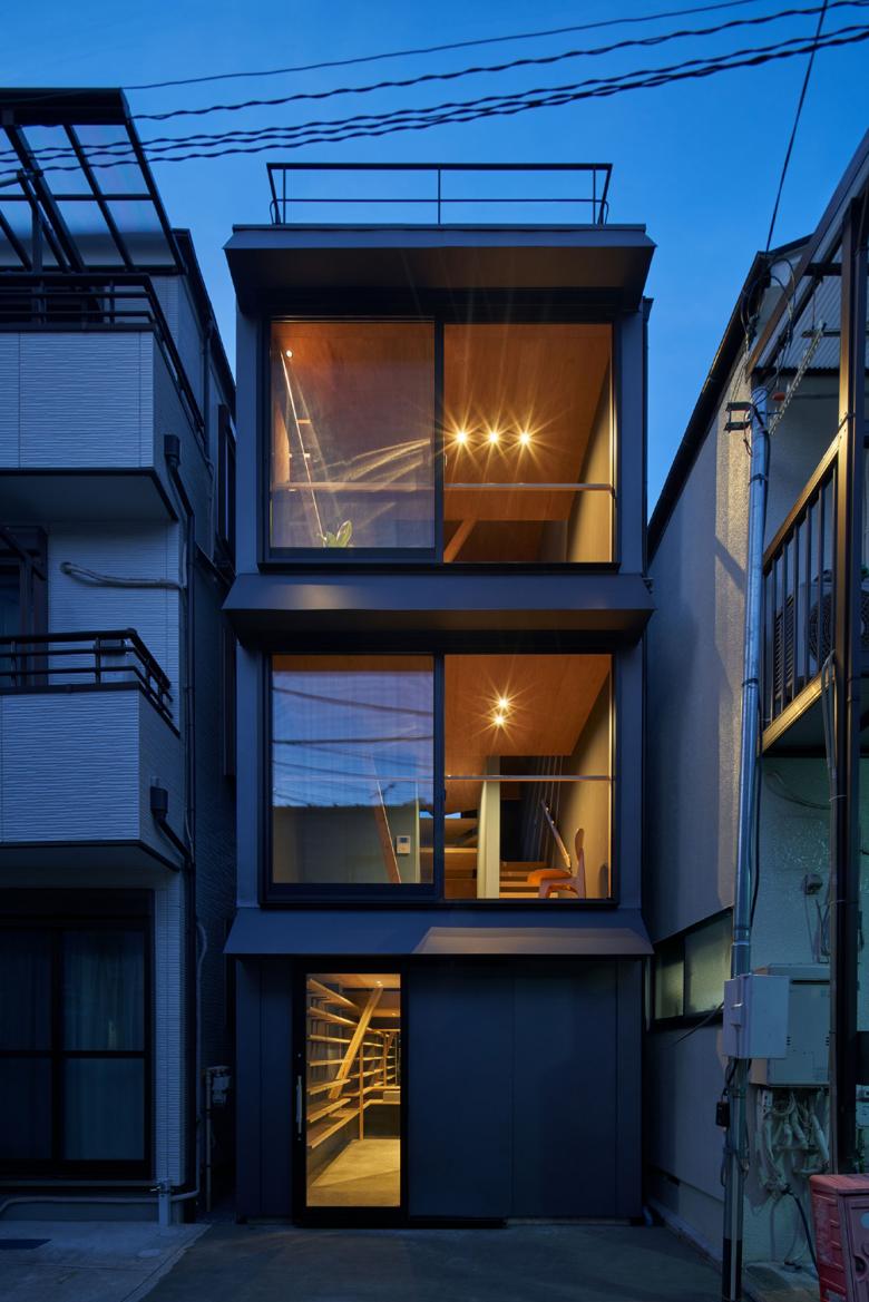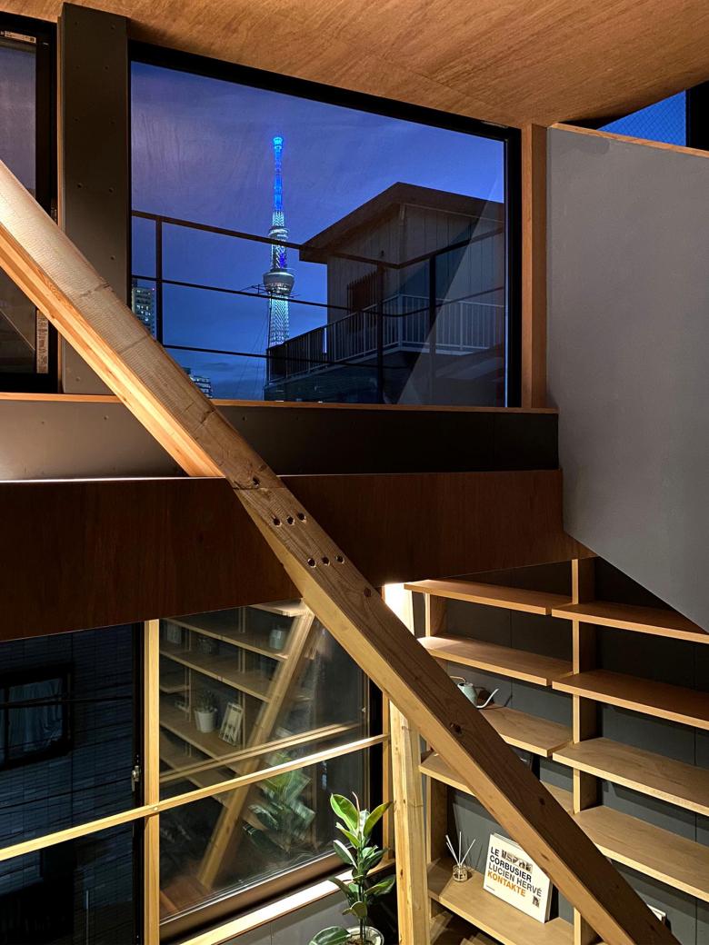ここでは一帯に建ち並ぶ狭小住宅の類型からその骨格を再考する試みとした。建物間口3.0mを開放し、奥行6.3mの前後に緩衝帯となる小さな床を積層し、周辺に慎重に参加する構えとした。またズレた床の振れ止めとして水平力を負担する立体ブレースを配し、力学的に壁量の多い下階から立体ブレースが導くその先に、スカイツリーを望む。