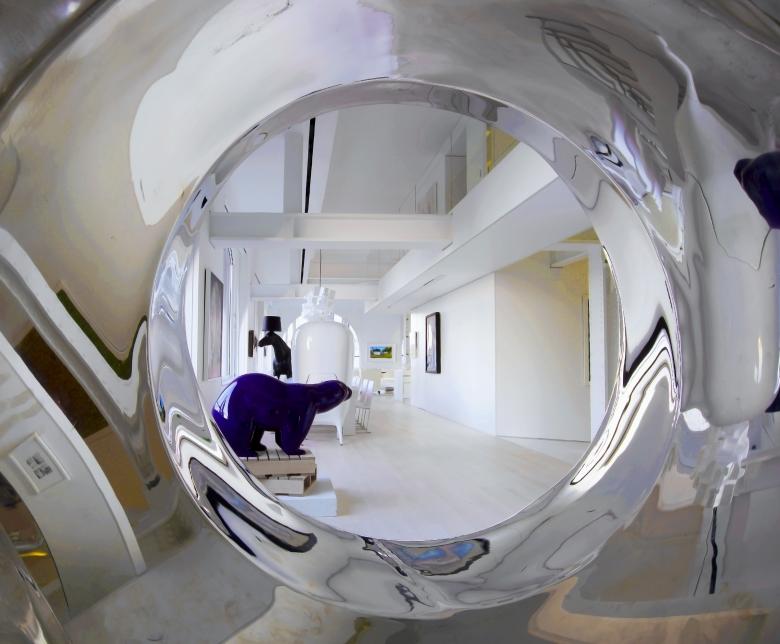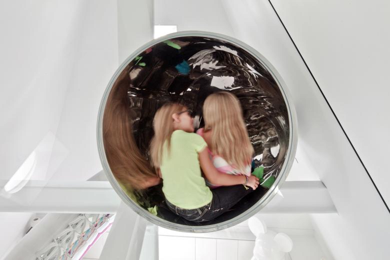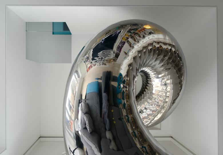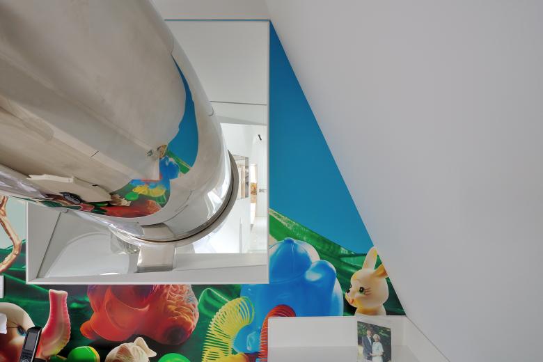 The entrance to a tubular slide, constructed from mirror polished stainless steel, emerges through a circular hole cut in the seamless sloping glass partition at the south end of the Attic. The first leg of the slide passes through the attic glass, coils around the column over the guest bedroom, then slips through a second seamless glass window and out over the stair. At the bedroom entrance a landing provides an opportunity to make a local stop at the third level or to re-enter the slide to continue down to the entrance level. The lower slide coils down through the ceiling and into the Library on the main level, suspended from a single point within the floor structure above. As it reaches the end, the helical slide tube flares out to create a distorted rectangular mirror which forms the wall of the Library and deposits the intrepid visitor back in the Entrance Gallery at the foot of the staircase.