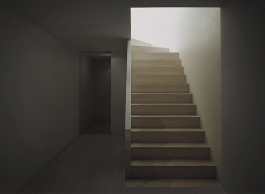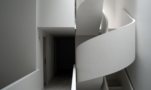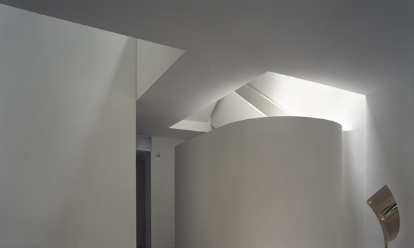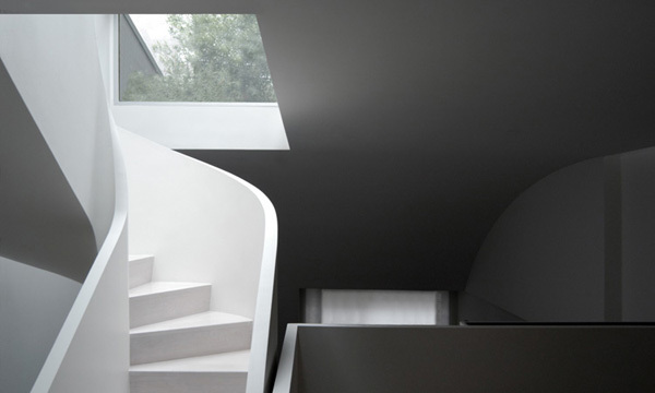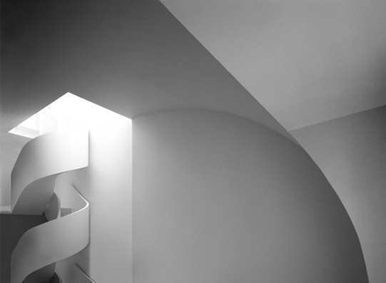 With such a pronounced vertical organization, the stair provides the focal element in the organization, use, and experience of the house. The new staircase passes from cellar spa to rooftop studio as a continuously transforming sculptural element. As the stair rises through the building, adjusting to the varied ceiling heights of the rebuilt stories, the enclosing walls around it gradually peel away, opening the stair to the surrounding spaces. As it reaches the double-height family room with its vaulted roof rising behind the exterior mansard, the stair completes its transformation to a pure freestanding helix, turning upward to access the new bedroom mezzanine and ascending through a skylit light shaft to the rooftop studio and exterior terrace.