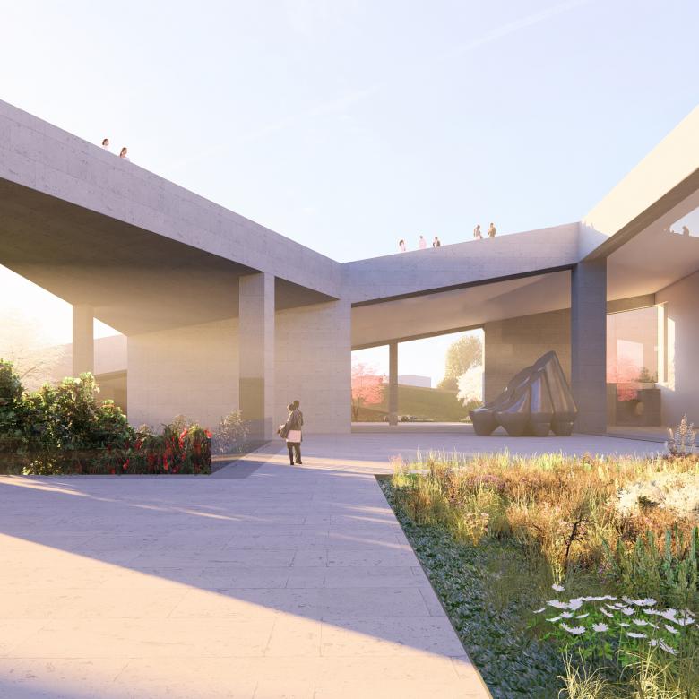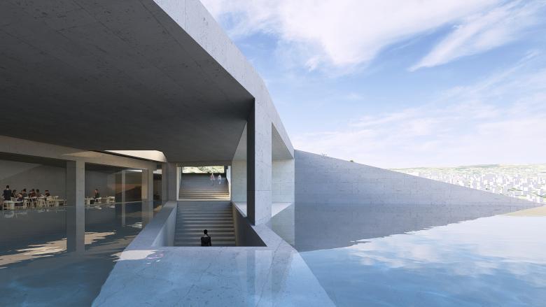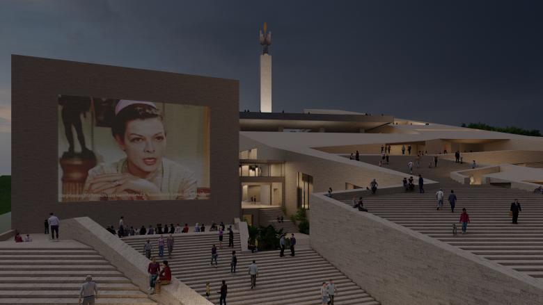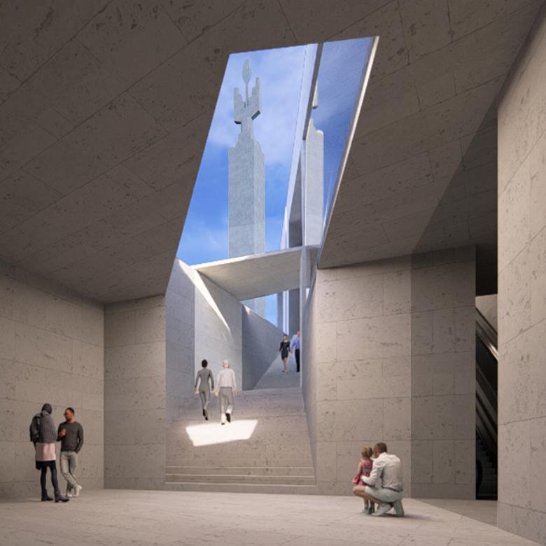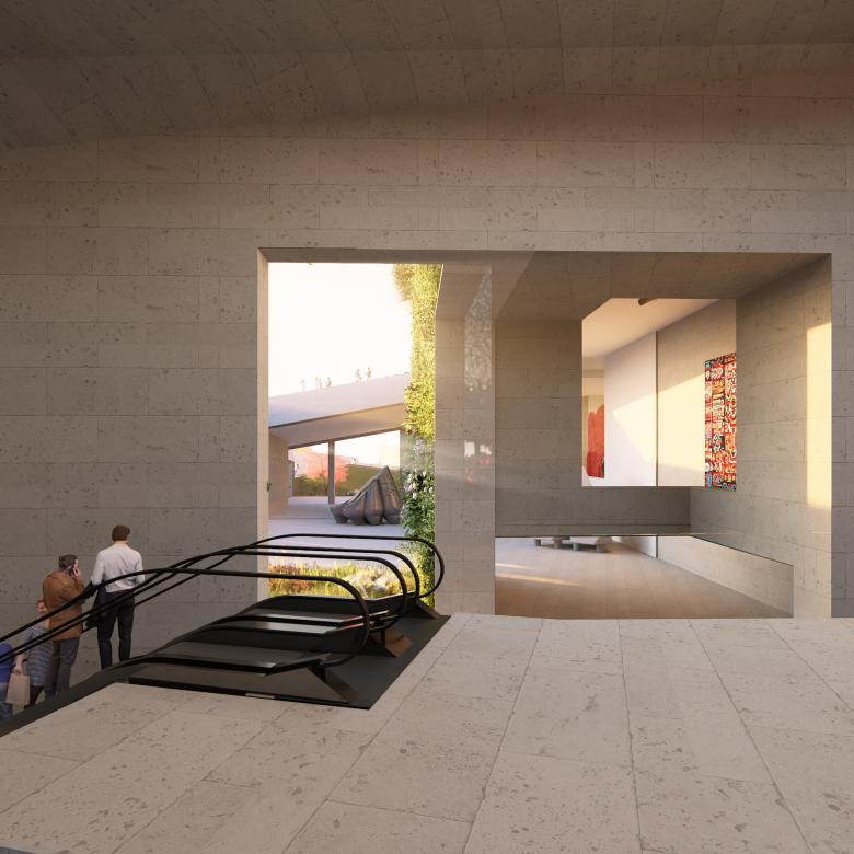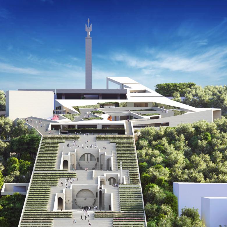 Courtyards and terraces bring light down into gallery spaces and offer peaceful, gardened spaces for cafes, restaurants, outdoor film screenings and performances, and informal social gatherings both formal and informal. Travertine and tufa finishes place the new architectural forms in the lineage of the historical Cascade; and thick plantings of native trees fill in the barren ground currently surrounding the complex, creating a green corridor connecting to Victory Park, which currently overlooks downtown Yerevan.
