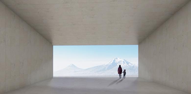 The public facilities of the cultural center are concentrated below the new datum, respecting the existing character of Yerevan's downtown skyline and preserving sightlines up from Tamanyan Park at the bottom and down from the monument terrace at the top. Key to the proposal is a continuous network of publicly accessible escalators, completing the pedestrian route to the top of the hill and carrying visitors through a shifting sequence of dramatic views—both interior, through the nested volumes and program spaces of the Cultural Center, and exterior, framing Yerevan's symbolic and cultural landmarks.