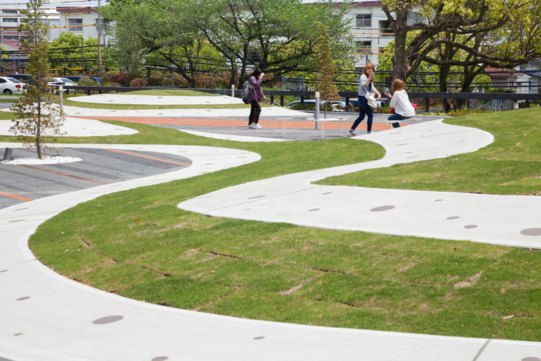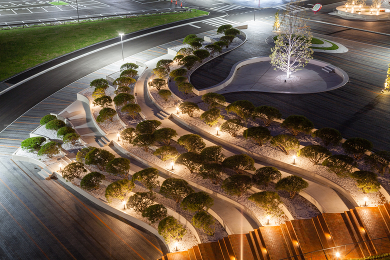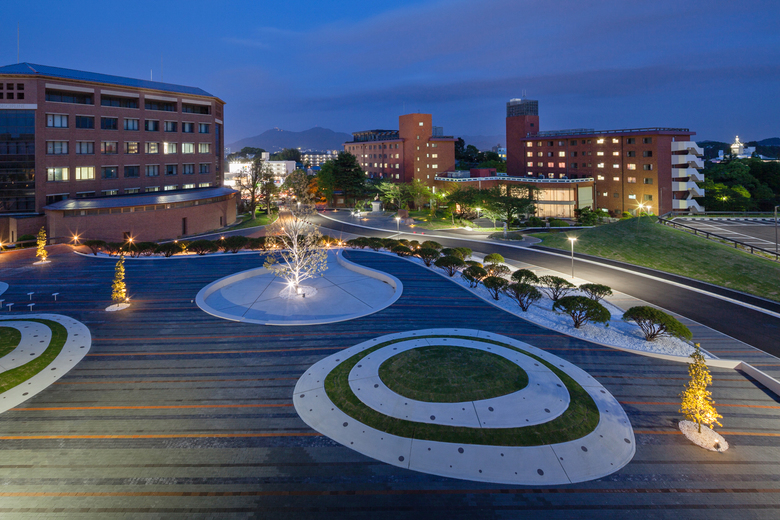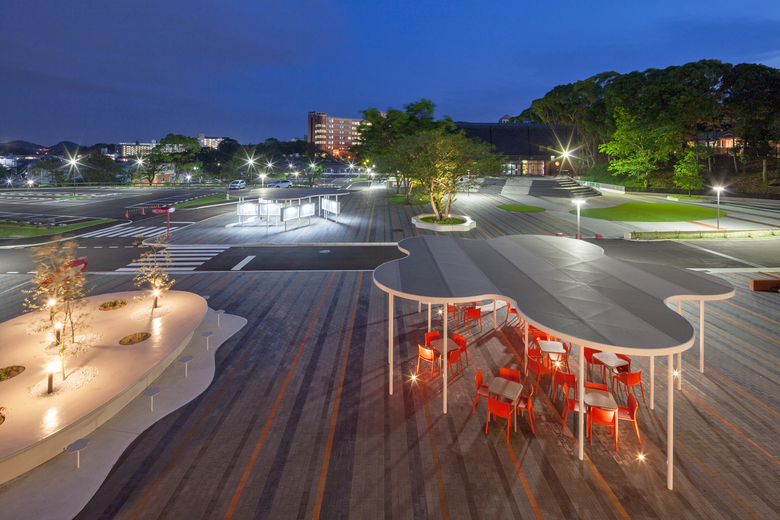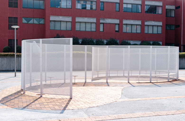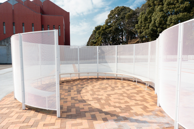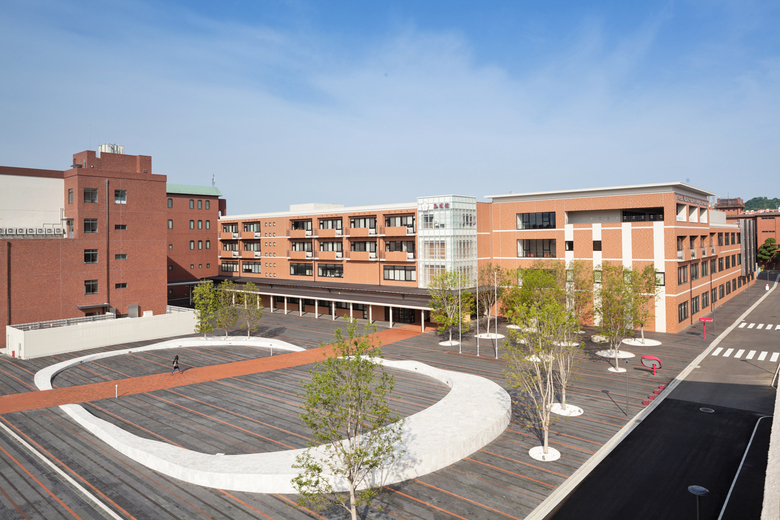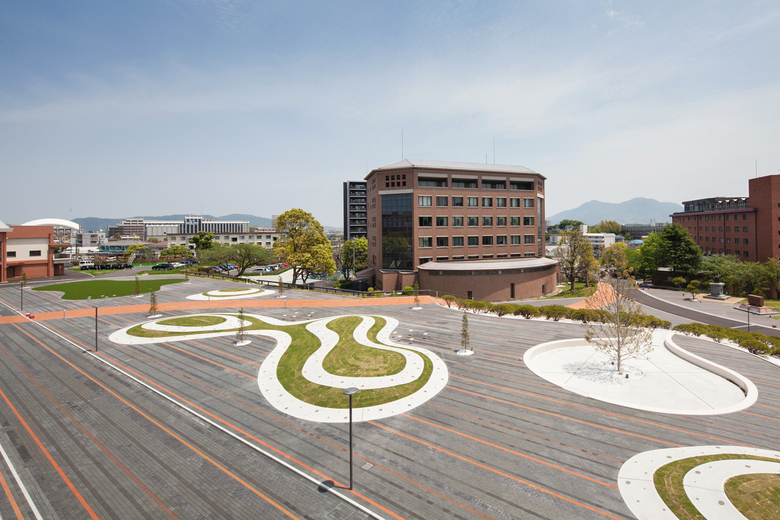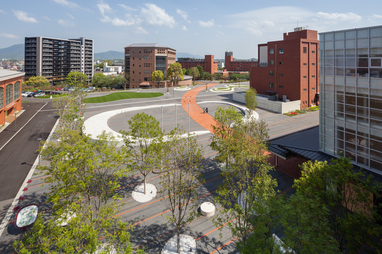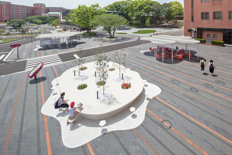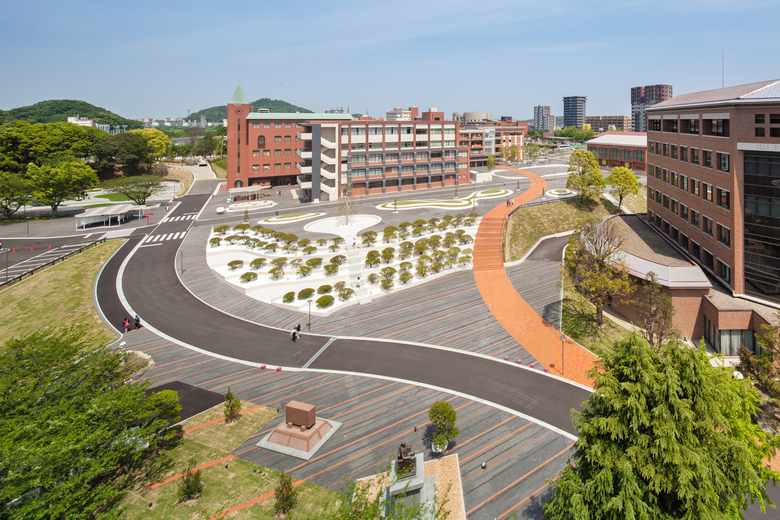 新校舎の建設に伴い古い校舎群が解体され、その結果キャンパス内に広大な屋外空間が生まれた。広大な屋外空間に特徴の異なる5つの広場を計画しそれらを緩やかに繋げることで、学生たちのアクティビティがキャンパス全体に広がっていくことを期待した。ファニチャーやパーゴラ、シェルター等、各広場のポイントとなる要素に対しては、あえてモニュメンタルなデザインを施すことによって、学生たちに活動の拠り所を明示したいと考えた。屋外空間の面的な広がりと緩やかな高低差の中に、モニュメンタルな活動の拠り所を点在させることで、キャンパス全体が公園のような大らかなで開放的な環境になればと思っている。