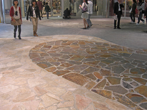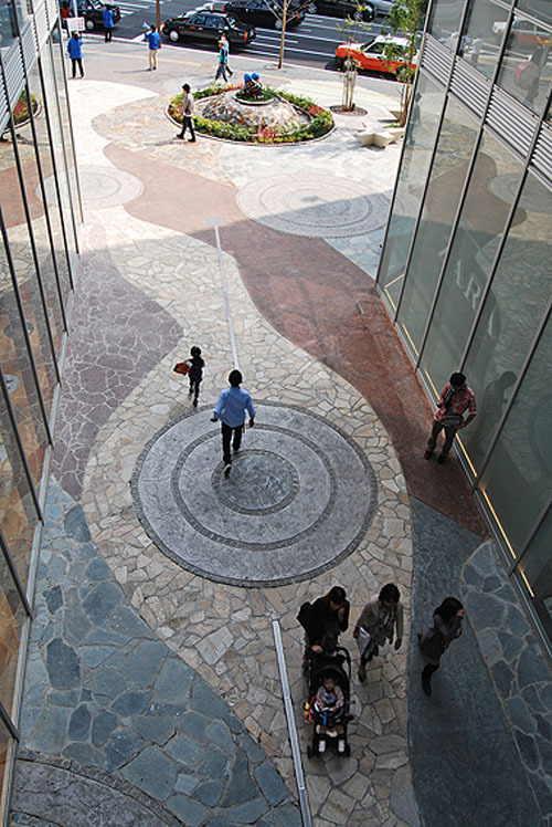 舗装デザインのコンセプトは「水の流れ」である。キャナルシティ博多の「運河」と連続する「水の流れ」を作ることによって、キャナルシティ博多から「人の流れ」をイーストビルに引き込むことをイメージしている。