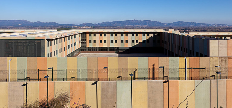 This prison located in the city of Figueres (Alt Empordà) has been designed with the aim of organizing all the activities taking place in it along a central road that crosses transversely the field. This road , which is wide and rich in vegetation acts as the backbone of the prison. On one side of it, is the residential building for the basic activities of prisoners : sleeping, eating and entertainment areas. This building has been divided into 7 units , 32 cells each , has a " u" . There are 2 units , 32 cells each , one for women and one for youth. In total , 512 cells. On the other hand, have placed several separate buildings : the workshop, hospital , cultural center and sports center. The prison is surrounded by a safety zone behind which are placed other buildings for visitor access . Besides functional designs, which are essential in this type of project , it has also taken into account the natural landscape integration, especially in terms of colors and the lights of downtown .