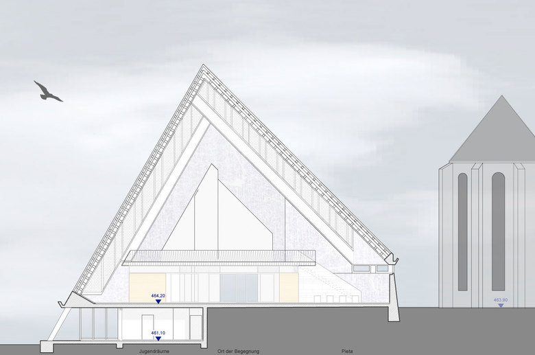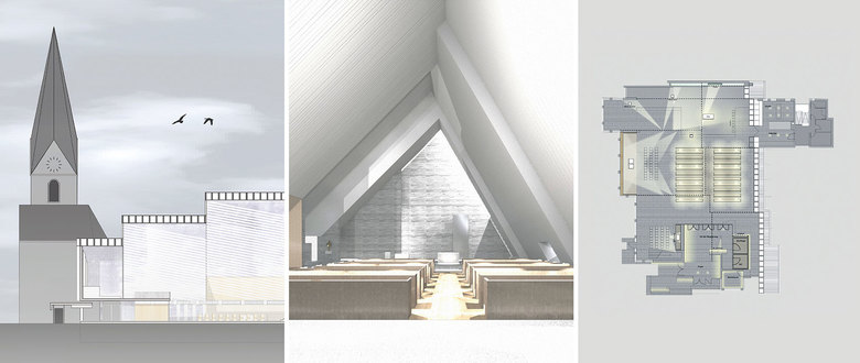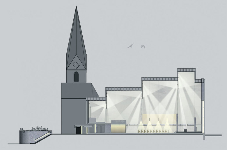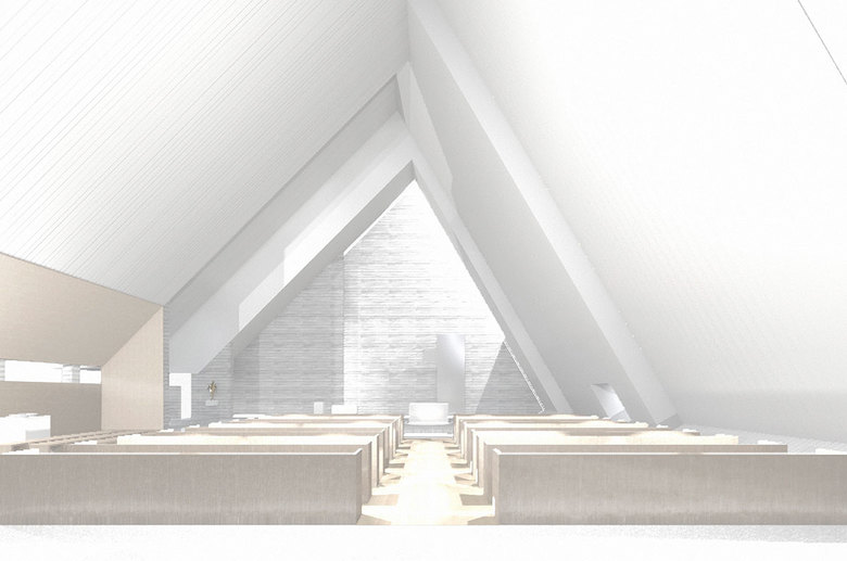 Das Kunstlicht folgt der Architektur und dem Raumgedanken. Pendelleuchten über den Stuhlreihen erzeugen eine Lichtinsel. Richtbare Strahler, entlang der oberen Dachkanten positioniert, korrespondieren mit den Elementen des Glaubens. Oberflächen von Stein und Eichenholz im Altar- und Taufraum werden über vertikale und horizontale Lichtlinien hervorgehoben. Im Eingangsbereich illuminieren Lichtlinien die vertikalen Wandflächen, so ist der Ort der Begegnung auch von außen gut lesbar.