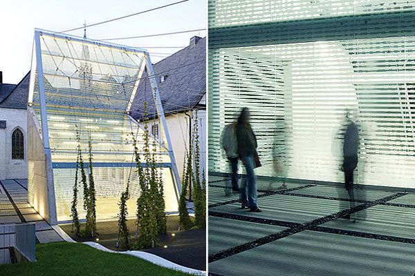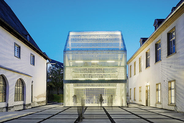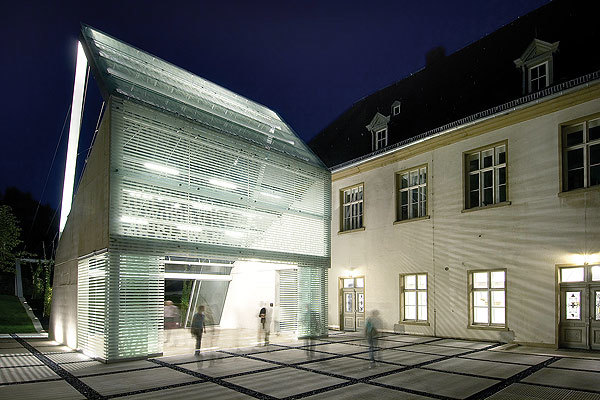 Das Lichthaus markiert die Grenze des historischen Klosterhofes, tagsüber transparent und sonnendurchflutet, am Abend ein leuchtender Kubus. Kombinierbare unterschiedliche Lichtquellen tauchen Architektur und Natur in wechselnde Lichtstimmungen.