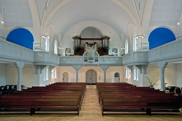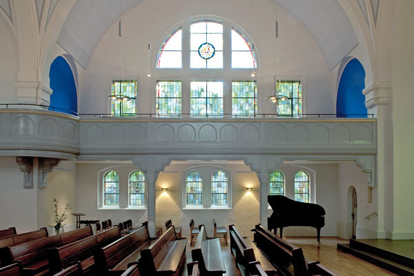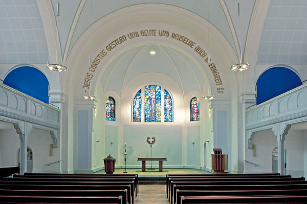 Das Farb- und Beleuchtungskonzept unterstützt die architektonische Raumgliederung der Martin-Luther-Kirche in Brambauer. Durch den Einsatz zurückhaltender Beleuchtungskörper tritt die ursprüngliche Architektur in den Vordergrund. Der Altarraum mit seinen Prinzipalstücken und der kostbaren Glasmalerei entfaltet seine besondere Wirkung unter dem Vierungsgewölbe.