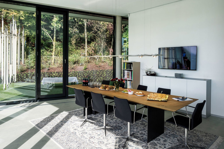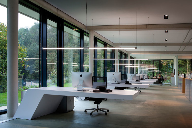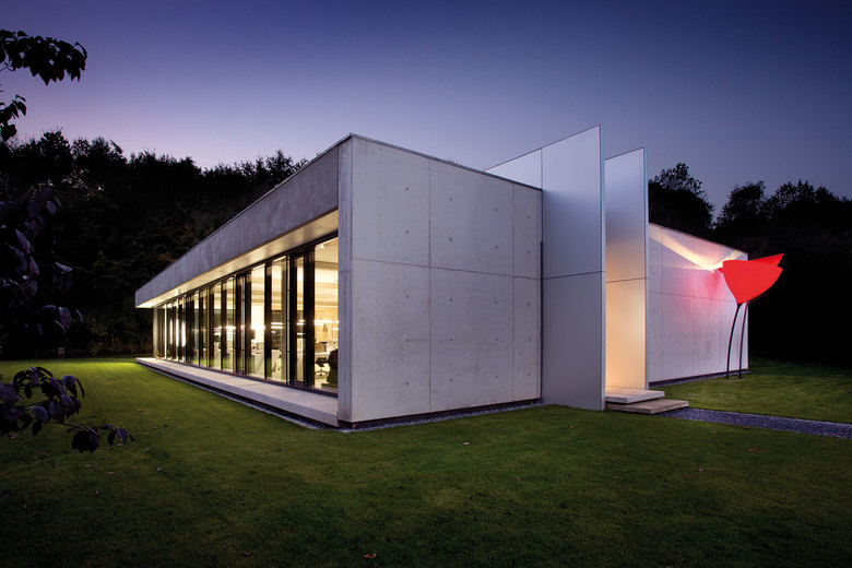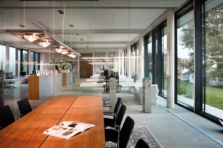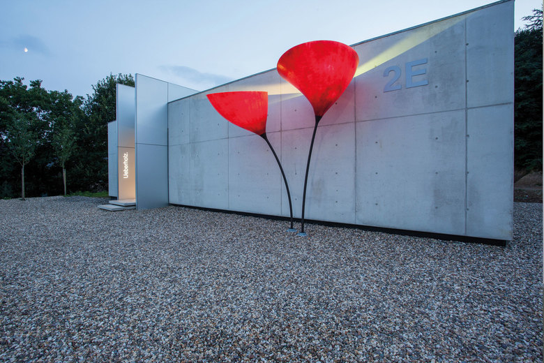 In der Symbiose sind die befreundeten Unternehmen ein professionelles Team für die Realisierung anspruchsvoller Projekte. Jetzt haben beide wieder eine weitere Kooperationsarbeit realisiert: Der neue, lichtdurchflutete Firmensitz des Büros Ueberholz, ein futuristisches Haus aus 1.600 Tonnen Beton, 22 Tonnen Stahl und viel Glas.