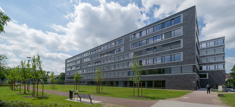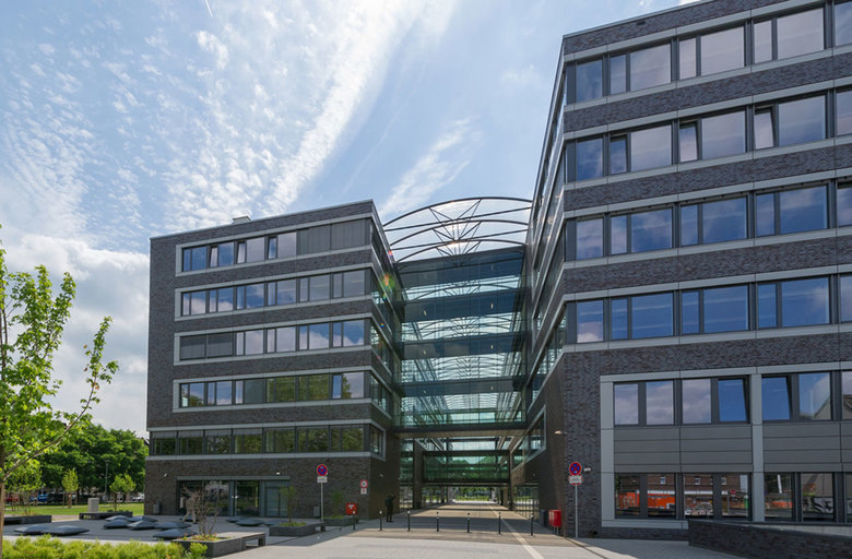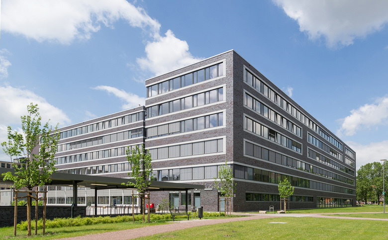dem gesamten Gebäude ist ein zweigeschossiges Parkhaus untergebracht, das 450 Stellplätze für die Angestellten und Schüler bereithält.